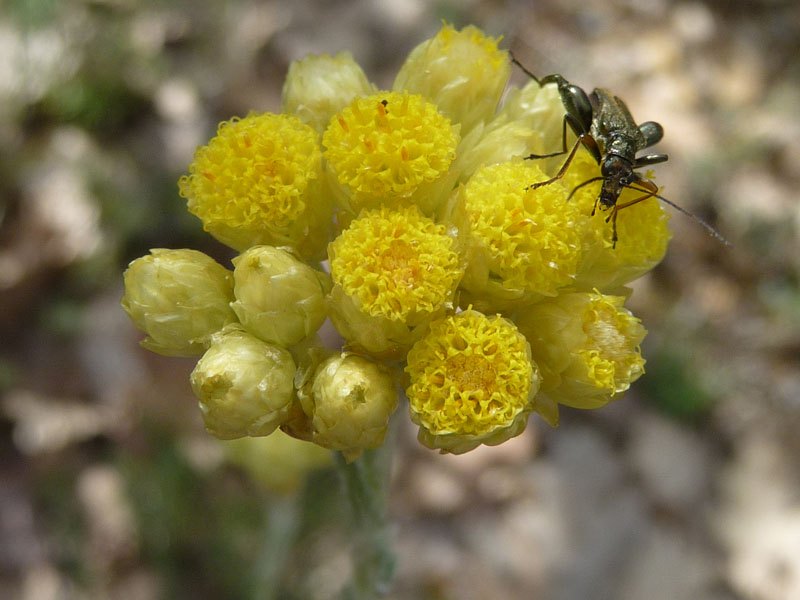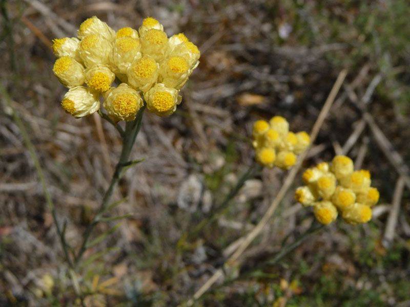 L'immortelle commune est présente dans les Basses Alpes jusqu'à environ 1000 mètres. C'est une plante vivace à tiges dressées blanches et tomenteuses. Les capitules sont groupés en corymbe serré. Chaque fleur possède un involucre de 4 à 6 mm de diamètre. On la trouve dans des lieux secs et ensoleillés : garriques, sables maritimes, côteaux rocailleux...Utilisée dans le traitement des rhumes. Propriétés anti-inflammatoire antitussive, antibactérienne, antifongique... (Wikipedia)