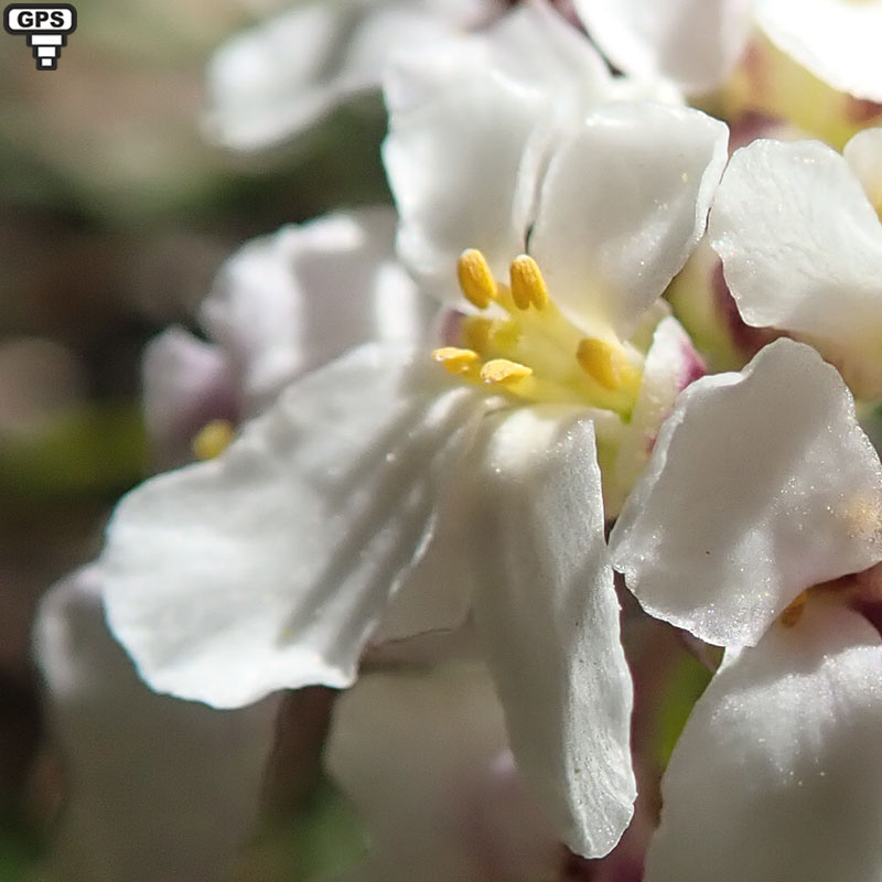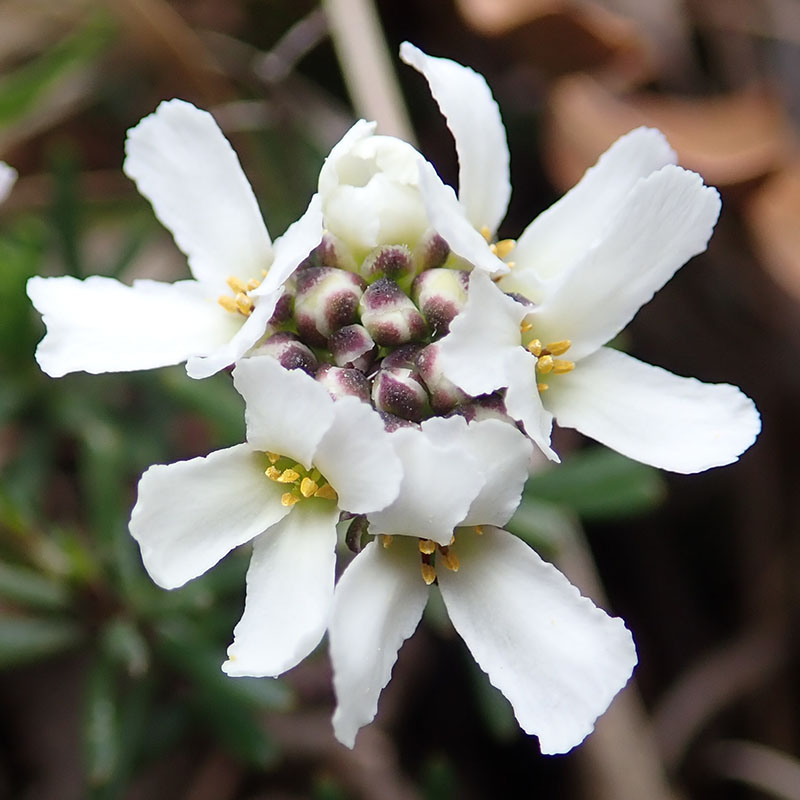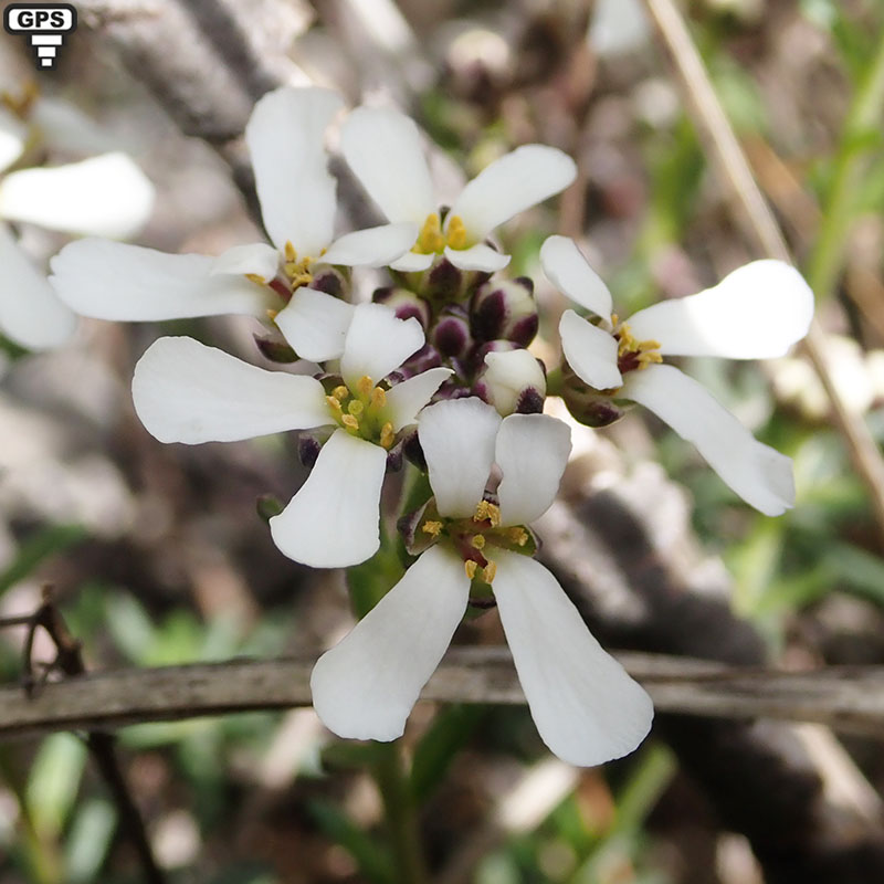 Plante compacte poussant dans des fissures de rochers calcaires, l'ibéris donne des grappes de petites fleurs blanches parfois teintées de pourpre au bout de pédicelles étalés. Les sépales concaves sont teintés de rouge sur les bords. On les trouve entre les rochers sur les côteaux calcaires dans le Midi de la France.