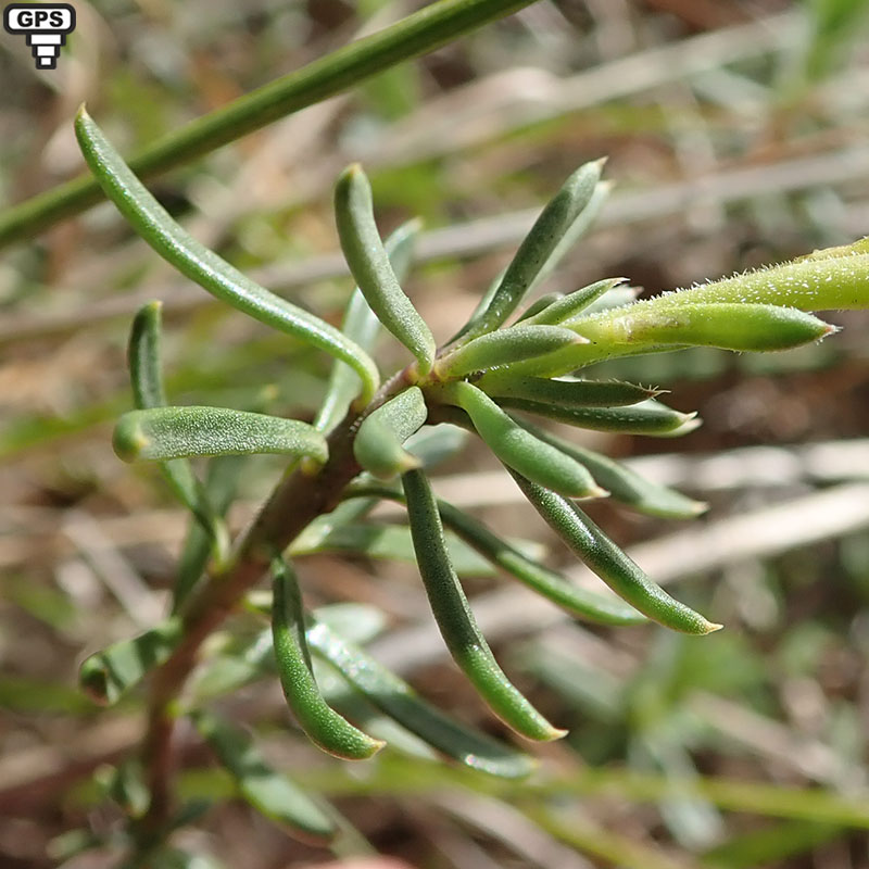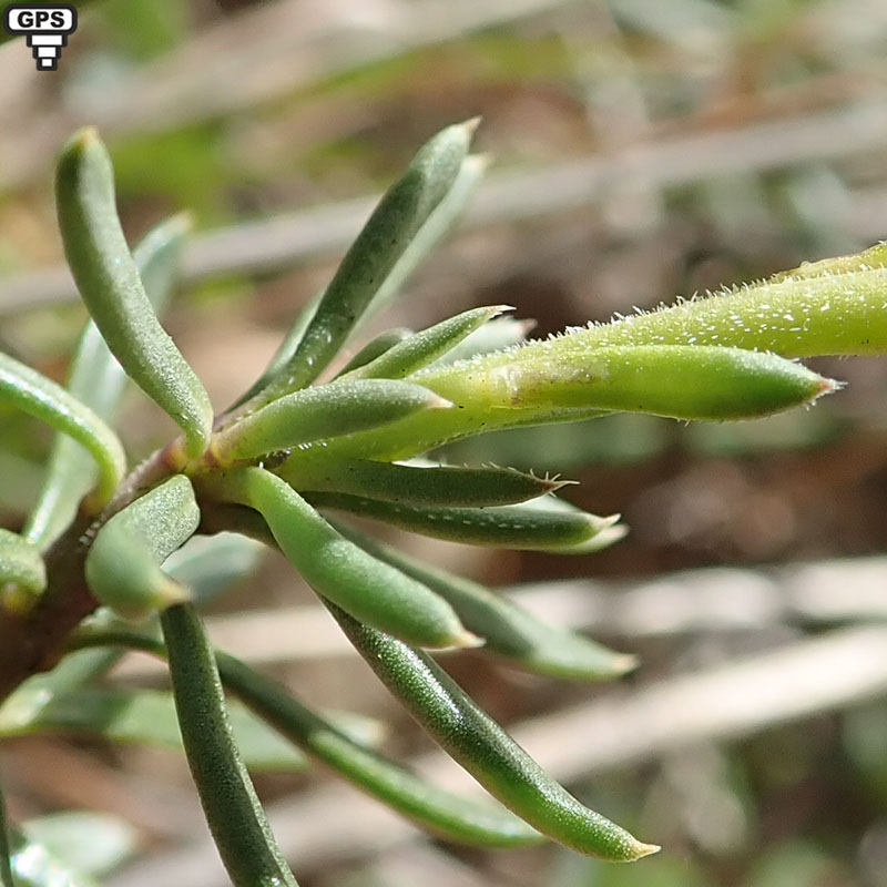 Feuilles charnues, demi-cylindriques, linéaires, mucronées, entières, glabres, très nombreuses et rapprochées
