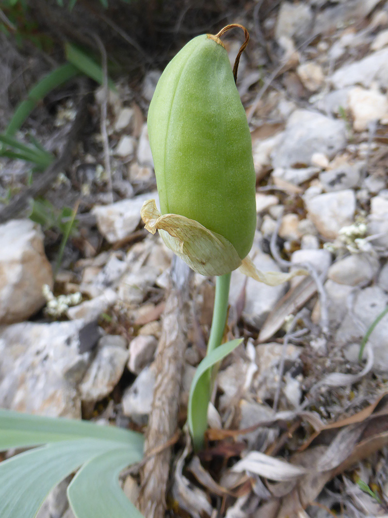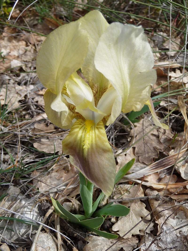 L'inflorescence de cette plante est composée d'une ou deux fleurs. Elles sont entourées par une spathe verte. Les trois tépales externes portent chacun une barbe centrale de poils jaunes. On rencontre l'iris jaunâtre dans les garrigues bien exposées au soleil du Sud-Est de la France. Il aime les sols calcaires, son rhizome s'accroche entre les roches. Malgré son nom, il peut être violet ou même blanc jaunâtre. Cette plante printanière peut refleurir à la fin de l'année si les conditions météo sont bonnes.