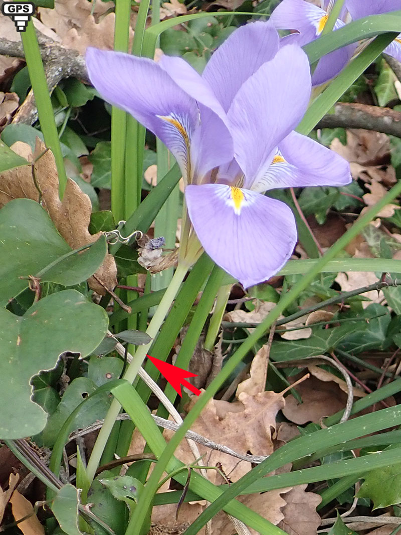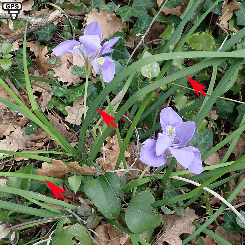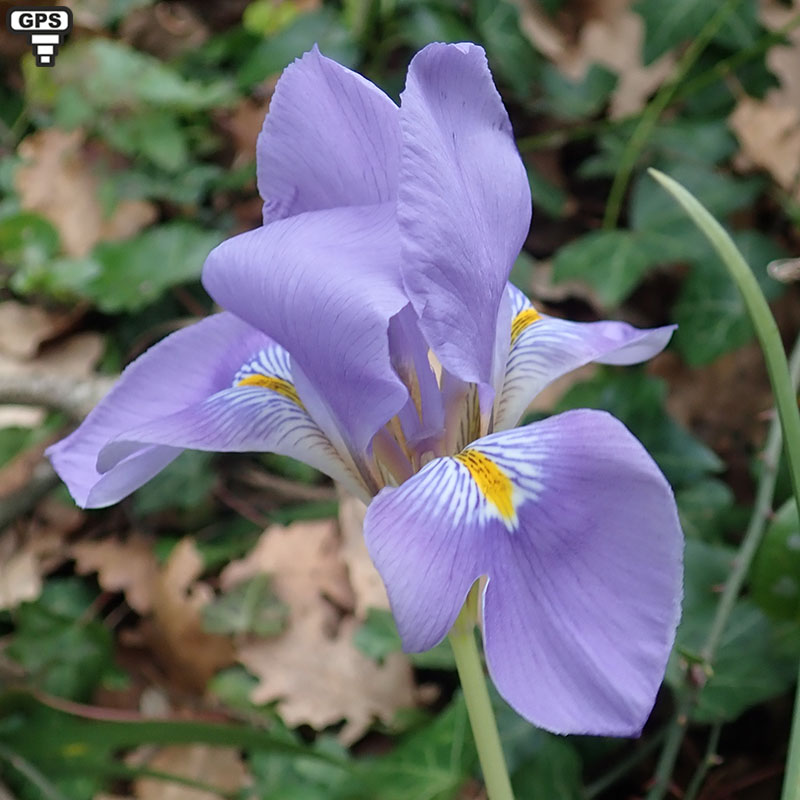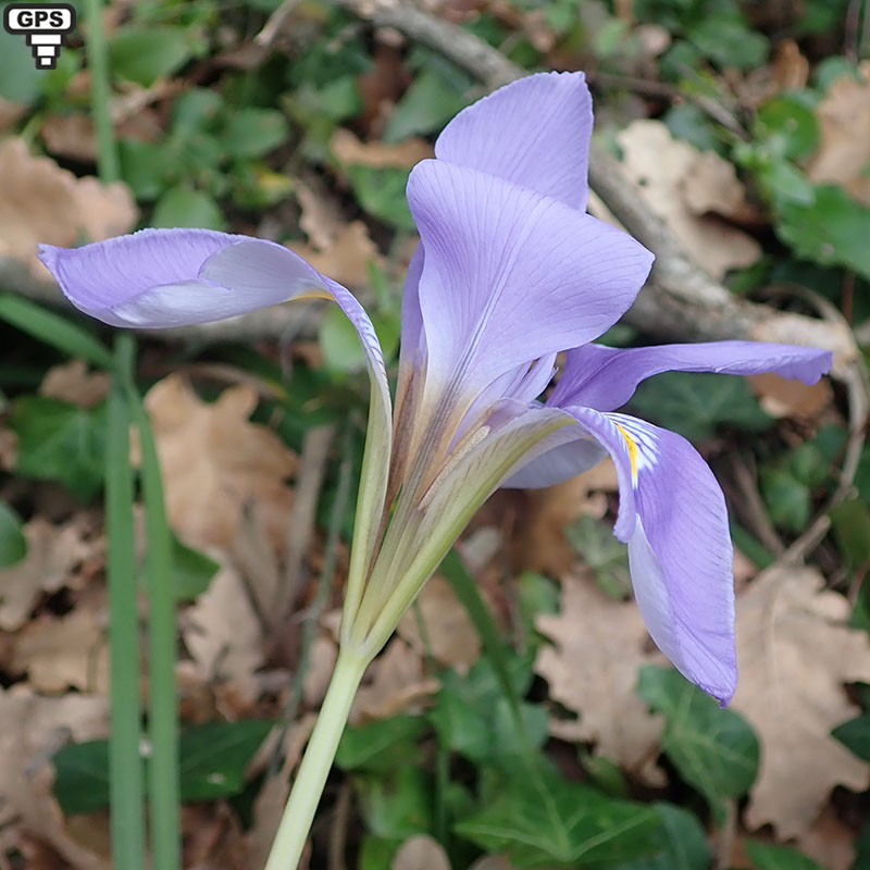 L'iris d'Algérie est une plante vivace à rhizome originaire du pourtour méditerannéen, elle est subspontanée ou naturalisée en Provence où elle croît sur des pelouses calcaires à basse altitude. Elle forme une touffe dense et évasée de feuilles linéaires et retombantes au fil de la croissance. Les fleurs délicates, au périanthe composé de six divisions pétaloïdes de couleur bleu clair, éclosent à l’extrémité d'une courte hampe florale. Les trois sépales sont larges, retombants et ornés d'un onglet strié de lignes blanches transversales et marqué d'une bande longitudinale jaune. Les trois pétales sont dressés, de couleur uniforme et plus étroits.