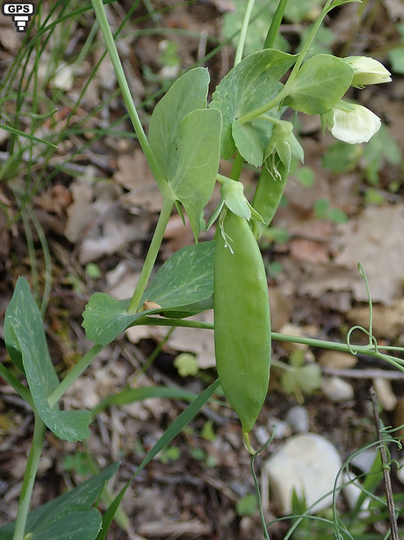 Le pois cultivé est une plante annuelle cultivée ou subspontanée que l'on trouve dans les champs et les vignes du Midi et de l'Ouest de la France. La tige creuse est peu ramifiée. Les feuilles opposées, sont composées d'une à quatre paires de folioles sessiles et sont terminées par une vrille ; à leur base on trouve deux stipules opposées, arrondies et embrassantes. Les fleurs, solitaires ou groupées par deux, sont blanc crème, bleuâtres, pourprées ou rosées avec les pétales nervés de vert pâle. Elles sont portées sur un rameau florifère égalant ou dépassant les stipules.