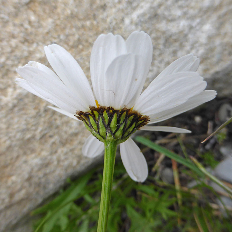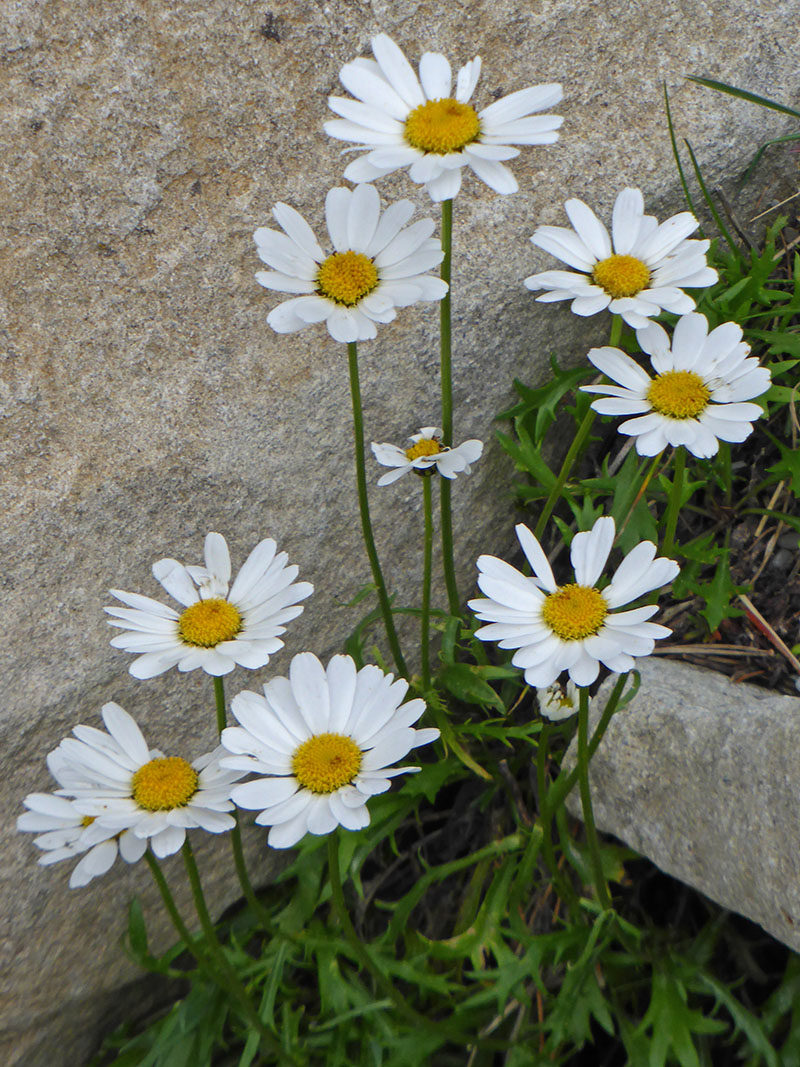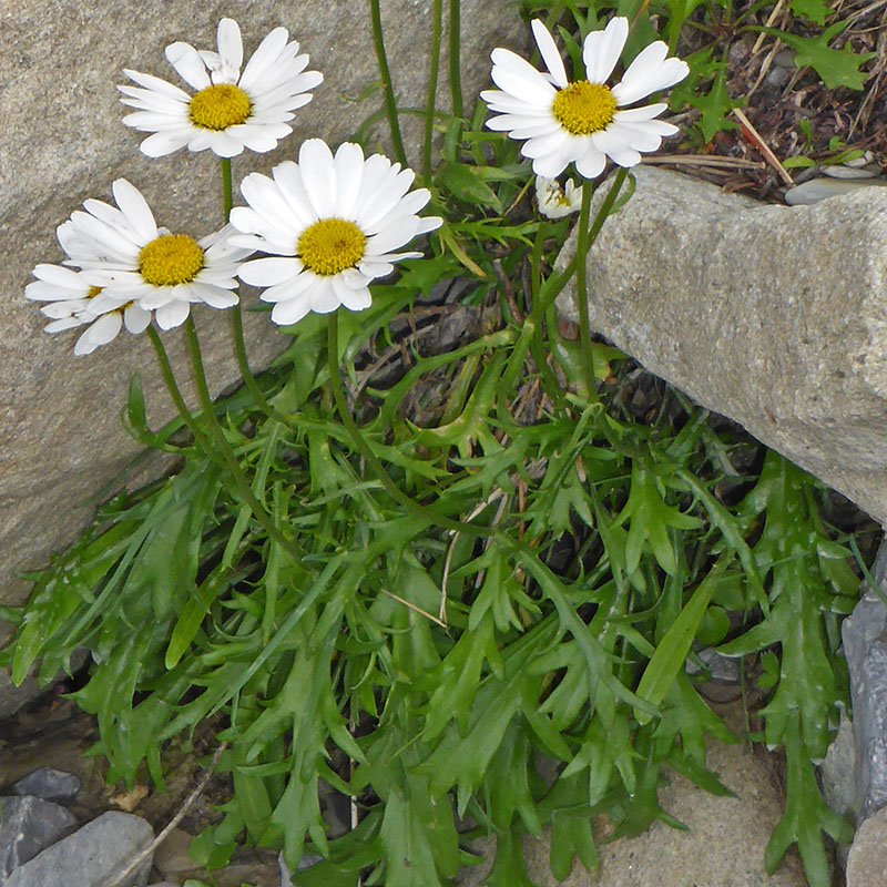 La marguerite des Alpes a des tiges forales très courtes. Ses feuilles sont très différentes : souvent pubescentes - blanchâtres, pennatipartites ou pennatifides ou digitées, à segments linéaires et entiers.