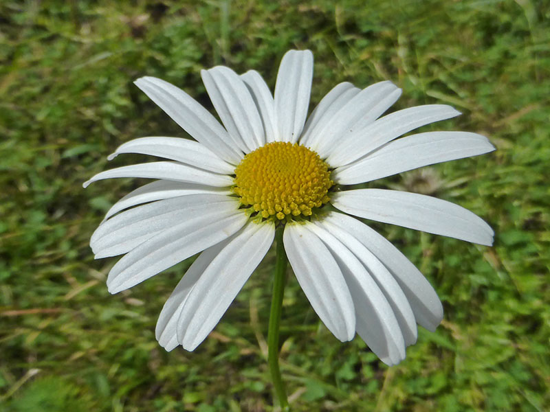 La marguerite est une des plantes les plus connues bien qu'on la confonde souvent avec d'autres astéracées aux fleurs presque identiques notamment dans le Midi de la France. Elle est commune surtout dans les prés et les prairies dans toute la France métropolitaine. Les feuilles moyennes et inférieures mesurent plus de 2 millimètres de largeur. La tige ou les rameaux sont dépourvus de feuilles au-dessous du capitule. Les capitules, avec des ligules blanches et longues (nettement plus longues que le diamètre de l'ensemble des fleurs tubulées jaunes) et des fleurs tubulées jaunes, sont grands (entre 4 et 10 cm). Les involucres, qui présentent des folioles bordées de brun, sont une forme de coupe et deviennent concaves après la floraison. C'est une plante vivace à tiges fleuries dressées et striées longitudinalement. Sa tige souterraine, ligneuse et ramifiée, assure sa pérennité.La marguerite possède des propriétés antispasmodiques, calmantes, digestives, astringente tout comme la camomille. (Wikipedia)