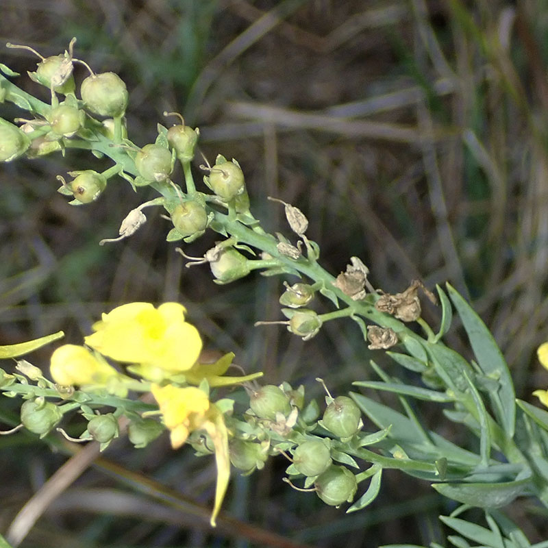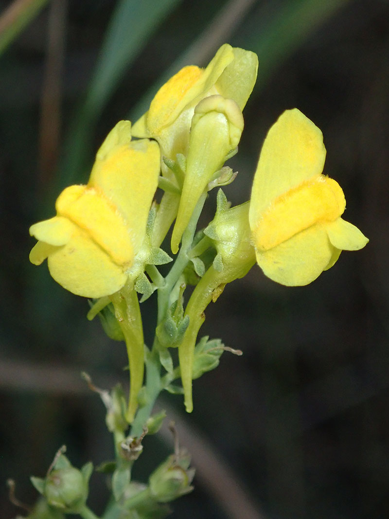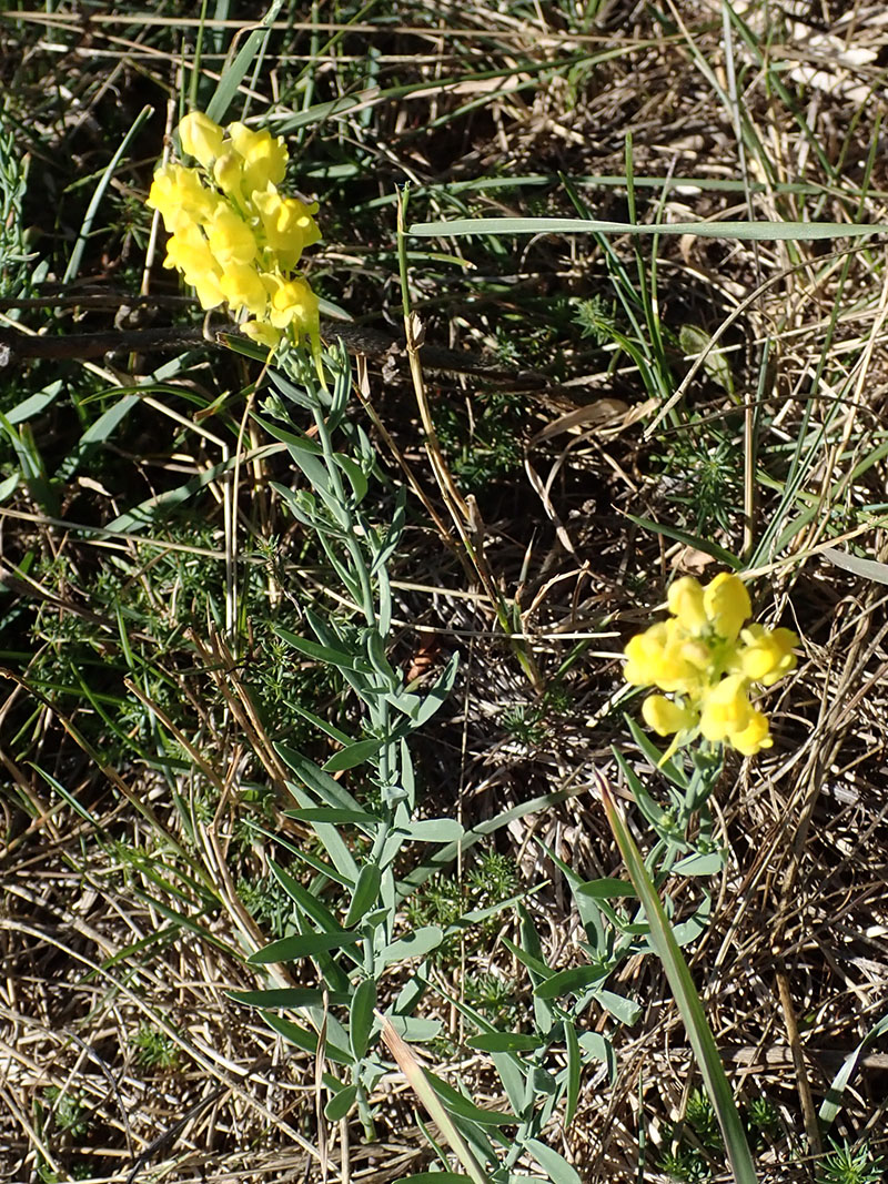 La linaire à feuilles étroites est une plante vivace et glabre poussant au bord des chemins, dans les prés et les clairières des montagnes siliceuses (Alpes principalement). Son port est dressé avec une tige non rameuse qui porte de nombreux feuilles glauques, entières, linaires - lancéolées, et un peu charnues réparties de façon aléatoire le long de la tige. L'inflorescence est une grappe spiciforme et dense de petites fleurs de 16 à 22 mm y compris l'éperon. La corolle d'un beau jaune citron et à palais plus foncé ou parfois orangé. Sur la même grappe, les premiers fruits apparaissent avant la floraison des dernières fleurs. La plante se perpétue et se multiplie surtout par des bourgeons adventifs qui naissent sur les racines.