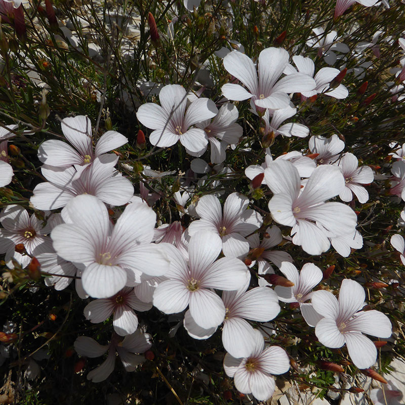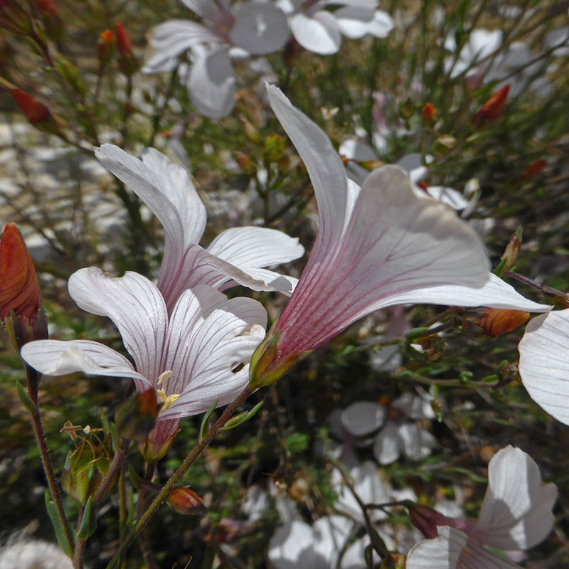 Le lin à feuilles de salsola est une plante vivace qui affectionne les sols rocailleux de préférence calcaires et ensoleillés du Sud des Alpes et de la Région Méditerranéenne. Son nom fait référence à la soude commune (Salsola soda), une plante halophile dont les feuilles sont assez semblables. Ses tiges sont couchées ou étalées-ascendantes et pubérulentes. Les feuilles alternes sont très rapprochées dans le bas, linéaires en alêne, raides avec une seule nervure. Les fleurs ont une corolle blanche rayée de veines violacée ou pourprée visibles surtout à la base et sur le revers des pétales. Ces derniers ont un bord externe très arrondi sans petite pointe ce qui permet de le différencier du lin à feuilles étroites. Les sépales sont lancéolés mais assez larges avec 3 nervures pas toujours très visibles. Cette plante se perpétue par des bourgeons souterrains et forme souvent un petit massif fleuri.