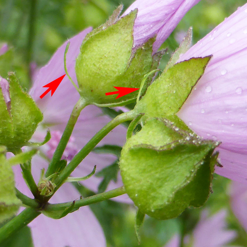 La mauve alcée est une plante plus grande mesurant jusqu'à un mètre de hauteur. Les trois bractées présentes sous les calices sont ovales et bien plus larges que sur la mauve musquée. Ses feuilles supérieures ne sont pas si finement découpées. Elle ne dégage aucun parfum. Elle préfère les terrains calcaires.