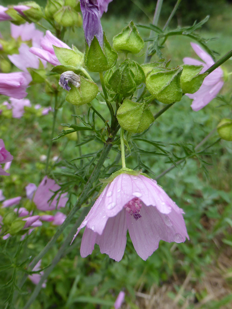 La mauve musquée est une plante vivace, couverte de poils et rameuse. Ses tiges dressées ne dépassent pas 60cm de hauteur. Elle se rencontre dans les bois clairs, les haies, les prairies, dans toute la France principalement sur des terrains siliceux. Les feuilles radicales sont suborbiculaires, les autres alternes, profondément découpées en segments étroits, pédonculées et munies de stipules. Les fleurs sont roses, grandes, solitaires à l'aisselle des feuilles et fasciculées au sommet. La corolle est deux à trois fois plus longue que le calice sous lequel on note la présence de très fines bractées linéaires. Elle dégage une odeur musquée surtout lorsque l'on froisse les feuilles.