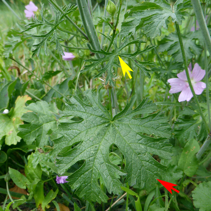 Feuilles les basales pétiolées, palmatifides, les caulinaires très découpées palmatipartites ou palmatiséquées, poilues sur le revers avec de petites stipules.