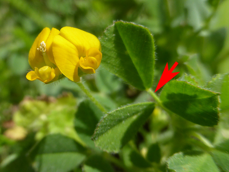 La luzerne d'Arabie a, le plus souvent, des folioles marquées d'une tache rouge-brunâtre. C'est une plante glabre.