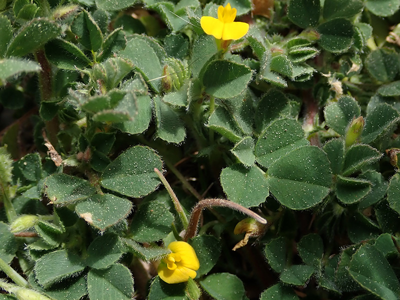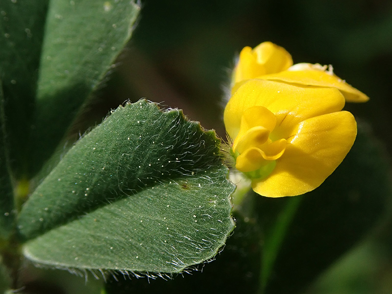 La luzerne naine est une petite plante très répandue que l'on trouve dans les prés et tous les endroits herbeux, sur les berges des cours d'eau, mais aussi dans les endroits secs et caillouteux ou le long des chemins. Les feuilles sont composées de trois folioles dentées dans leur partie supérieure et couvertes de poils blancs appliqués, les inférieures sont en forme de coeur. Les stipules sont entières ou dentées. Les fleurs sont solitaires ou groupées par 2 à 6. L'étendard est plus long que la carène qui est elle-même plus longue que les ailes. Le fruit, de forme globuleuse, est contourné en hélice et couvert de petits poils blancs. Ses épines sont d'abord droites puis se courbent en crochet. C'est une plante annuelle, entièrement pubescente, à tiges étalées ou dressées et à racine principale développée.