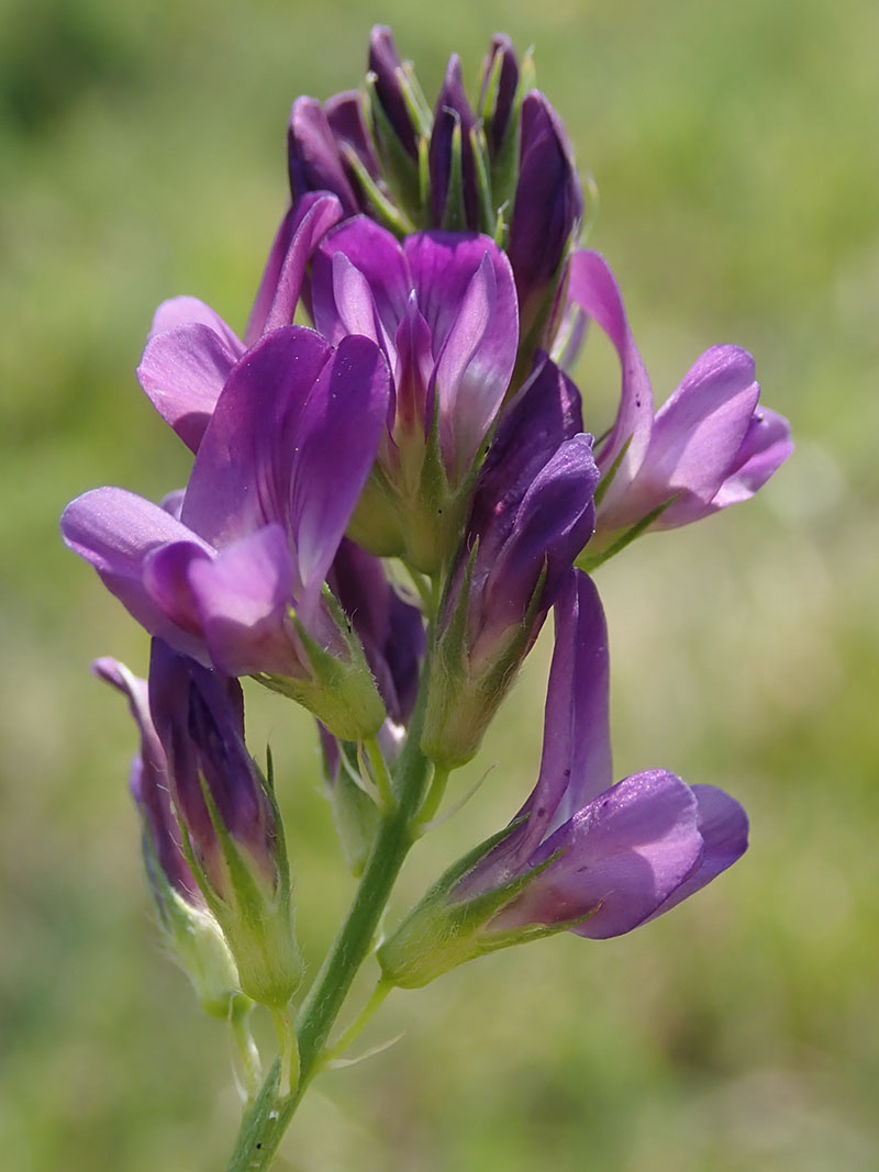 La luzerne cultivée est une plante vivace, glabre, à tiges souterraines ligneuses très profondes qui se perpétue par les divisions des rameaux souterrains ou parfois par des bourgeons produits sur les racines. Elle est cultivée comme le fourrage mais on la trouve aussi très souvent à l'état subspontané au bord des chemins, sur les talus, dans les champs ou dans les lieux incultes. Les tiges sont dressées ou ascendantes et très rameuses. Les feuilles sont composées de trois folioles obovales ou oblongues et dentés au sommet. La luzerne produit des grappes bien fournies de petites fleurs violettes. Le rameau florifère est plus long que la feuille à l'aisselle de laquelle il se développe. Chaque fleur est portée par un très court pédoncule qui est plus court que le tube du calice. L'étendard, fortement marqué de stries est plus long que la carène, et celle-ci a sensiblement la même longueur que les ailes. Le fruit est enroulé en 2 à 3 tours d'hélice, et orné sur les faces de nervures en réseau. A la maturité complète, il s’ouvre par son bord externe. La luzerne est cultivée pour sa teneur en protéine et sa capacité à améliorer les sols en fixant l'azote atmosphérique.La consommation de graines germées ou de jeunes pousses vertes de luzerne est très commune chez les adeptes de l'alimentation biologique. De toutes les graines germées habituellement consommées par l'homme, la graine germée de luzerne est celle qui contient le plus de vitamines. (Wikipedia)