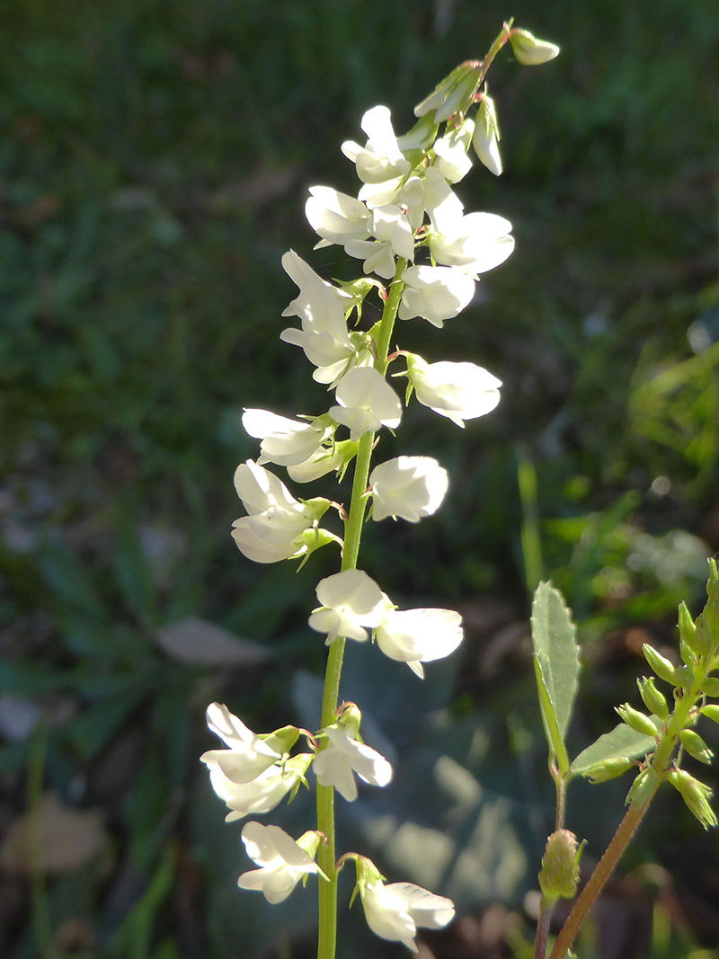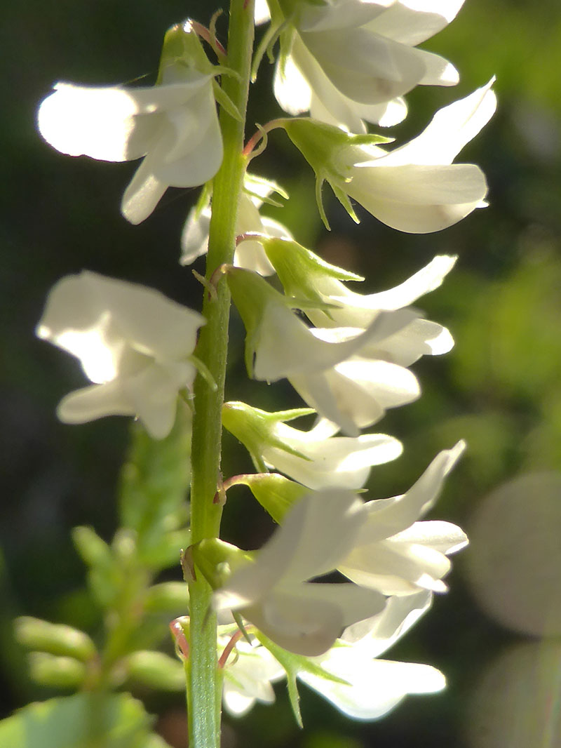 Plante bisannuelle, dressée, presque glabre, le mélilot blanc ressemble beaucoup au mélilot officinal mais ses fleurs sont blanches. L'étendard est plus long que les ailes et le calice est formé de 5 sépales pointus. Cette grande plante est courante sur le bord des chemins, aux abords des rivières, dans les champs sablonneux.
