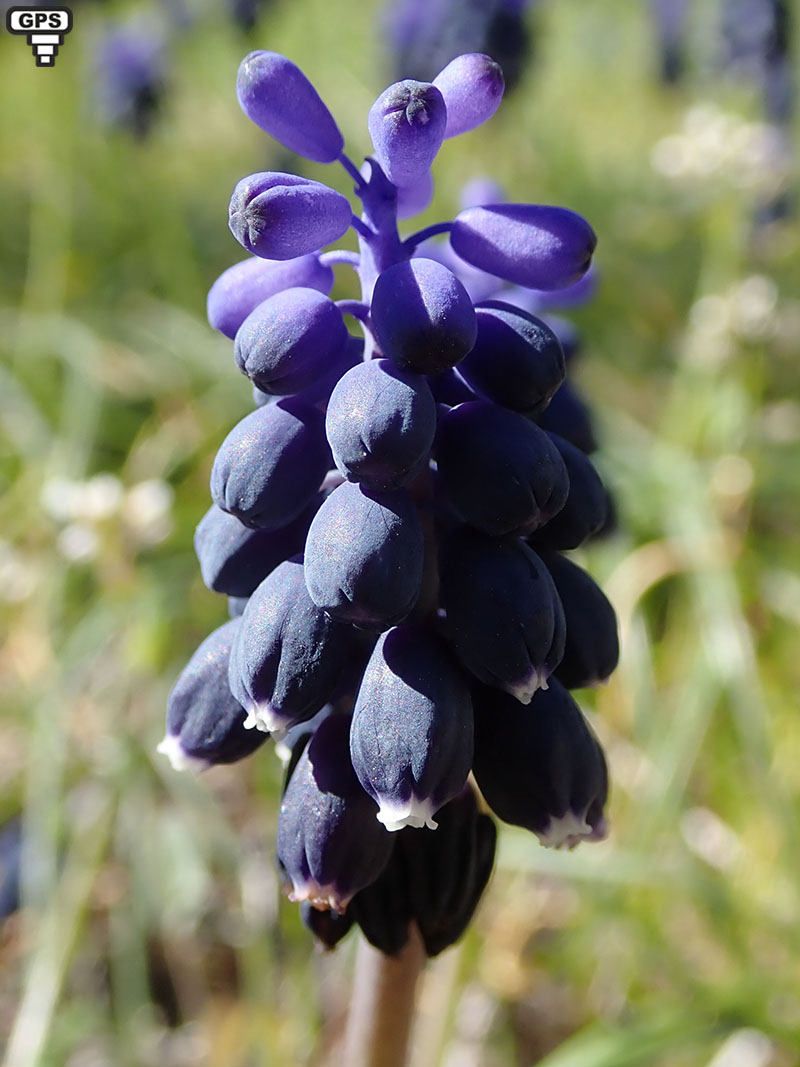 Le muscari à grappe est une plante vivace à bulbe présente dans les champs, au bord des chemins et dans les prés du Midi, de l'Ouest et du centre de la France. Les feuilles sont aiguës au sommet, presque cylindriques, profondément creusées en une étroite gouttière sur la face supérieure et mollement retombantes ou étalées sur le sol. L'inflorescence est un racème ovale de petites fleurs bleu foncé serrées les unes contre les autres. Elles exhalent une odeur de prune. Les fleurs sont tenues par des pédoncules très courts, presque nuls dans les fleurs du sommet. Celles-ci ne donnent pas de fruits, elles sont dressées et plus petites que les autres. La corolle réfléchie est terminée par de petits lobes blancs. Le fruit mûr s'ouvre par 3 valves échancrées dans le haut. Le bulbe est petit, ovoïde et brunâtre, il donne naissance à de nombreux et très petits bulbes ou caïeux qui multiplient la plante.