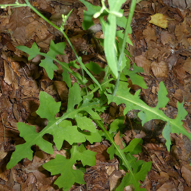 Feuilles lyrées profondément pennatipartites à lobes anguleux, rétrécies en pétiole ailé embrassant et auriculé à la base