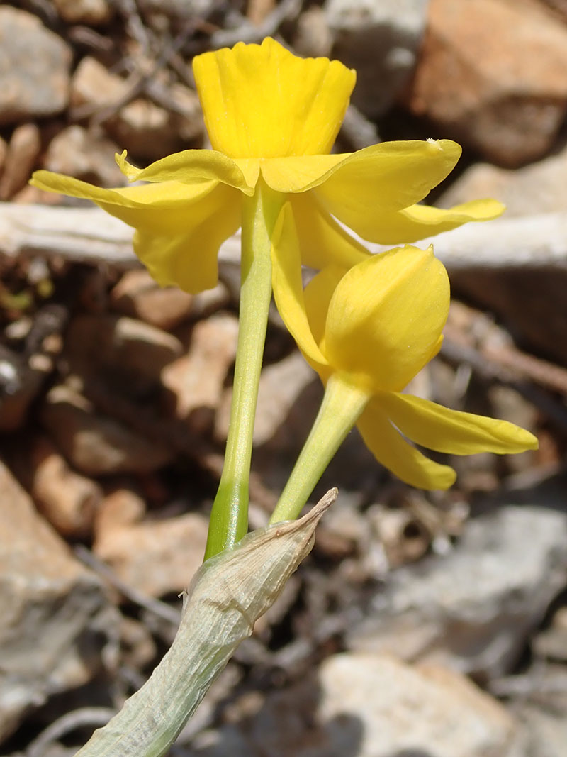 Le narcisse d'Asso est une petite plante vivace et printanière poussant dans les collines pierreuses calcaires et garrigues bien ensoleillées des régions méditerranéennes. Ses fleurs jaunes et odorantes sont isolées ou par 2 à l'extrémité de la tige. Le périanthe est en soucoupe au bout d'un long tube, il est formé de 6 tépales jaunes. La couronne est également jaune, en forme de coupe bordée de petites dentelures et haute de la moitié de la longueur des tépales. Une spathe lancéolée recouvre le pédoncule. Le bulbe est de la taille d'une grosse noisette.