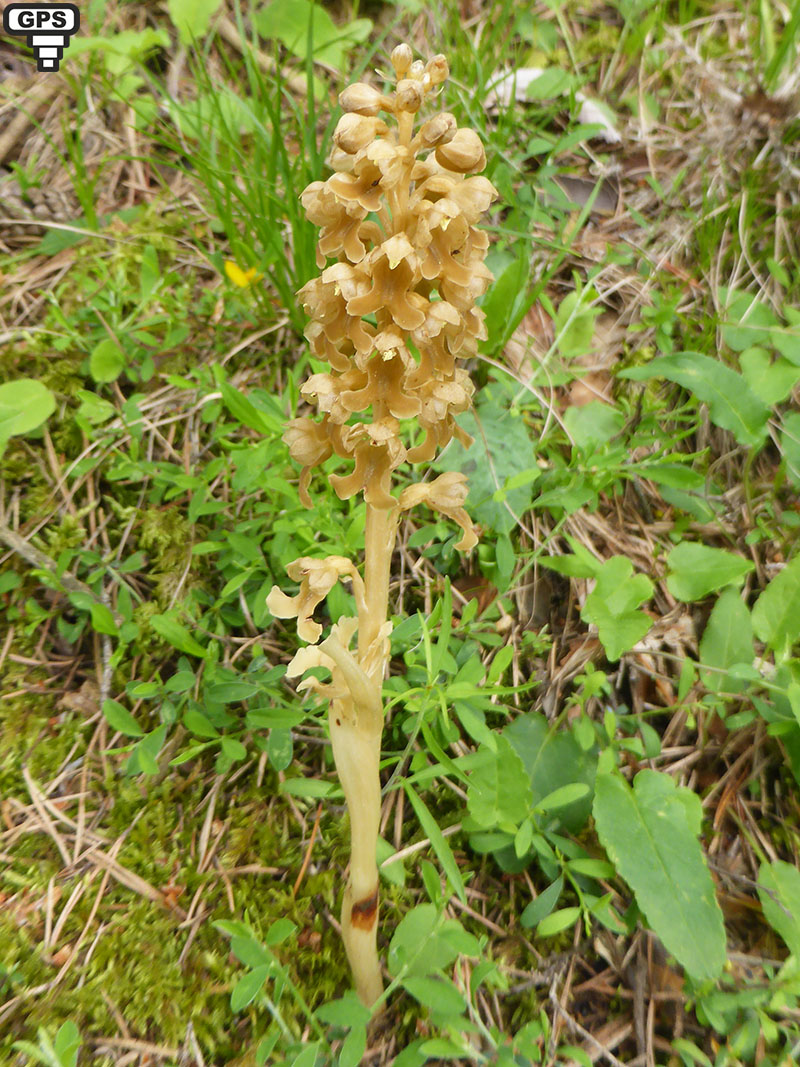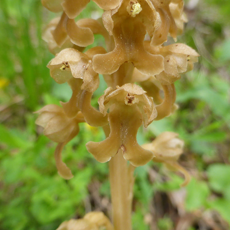 La néottie est une orchidée produisant des fleurs marron clair ne se distinguant pas du reste de la plante qui est lui-aussi de cette couleur ; elle pousse dans les bois clairs. Elle ne possède pas de chlorophylle et parasite des champignons pour subvenir à ses besoins. La fleur est sans éperon, les sépales supérieurs forment un casque et le labelle est marron et bilobé en forme de languette fourchue avec deux lobes très écartés. La tige, sans feuilles, est munie d'écailles engainantes ; les fleurs sont nombreuses et forment un épi serré. C’est une espèce vivace, à tige souterraine couverte de nombreuses racines adventives courtes et charnues aussi grosses qu’elle.