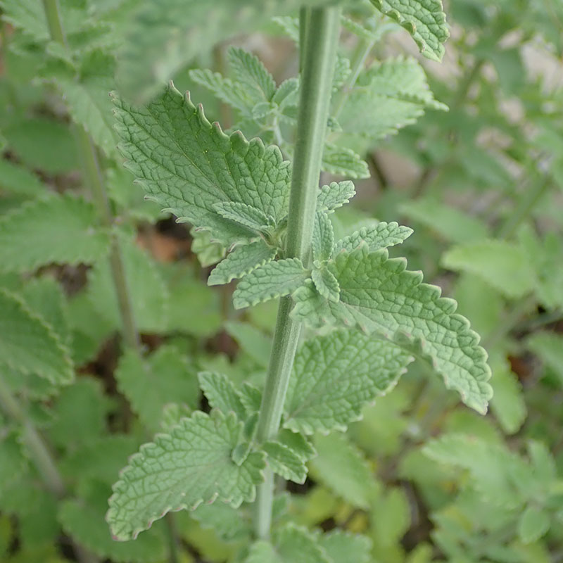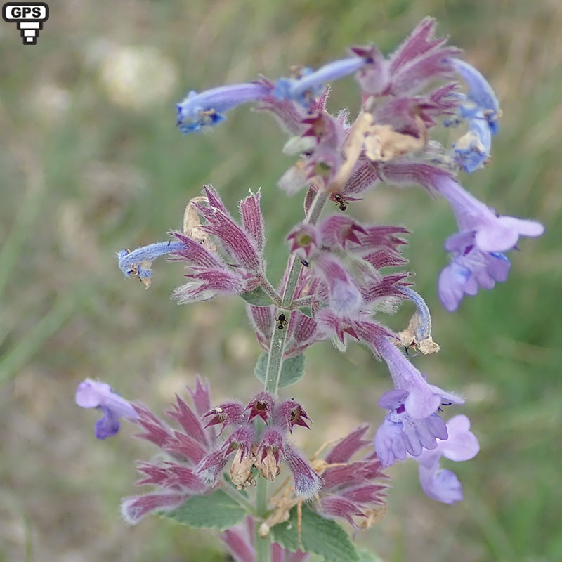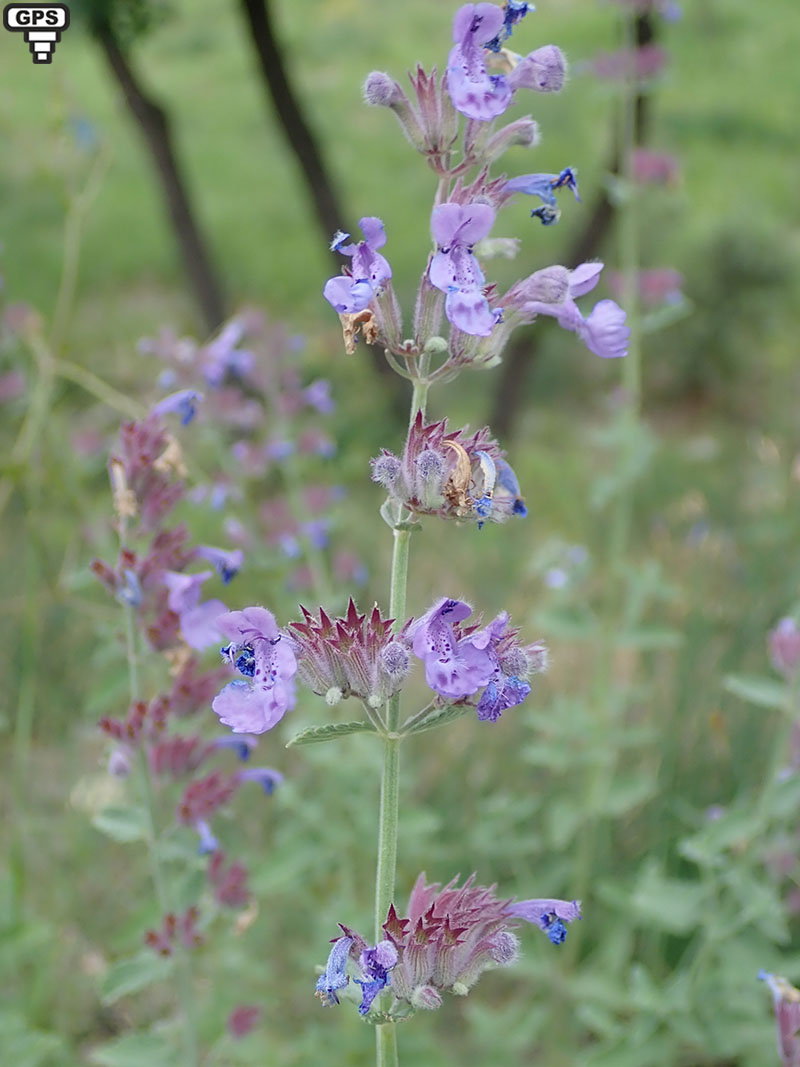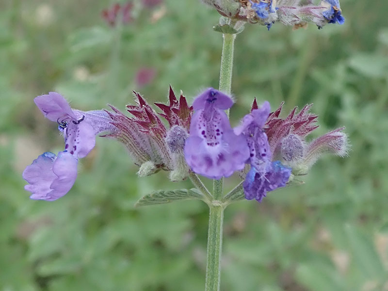 Le népéta herbe-à-chats est un hybryde obtenu par un croisement entre Nepeta mussinii et Nepeta Nepetella. Il a tendance à se naturaliser aux abords des habitations. Cette plante, à port buissonnant fournit de belles inflorescences en verticilles avec de nombreuses petites fleurs bilabiées bleu-violet à gorge tachetée de violet. Les corolles tombent à maturité et laisse apparaître les calices rougeâtres à dents pointues.