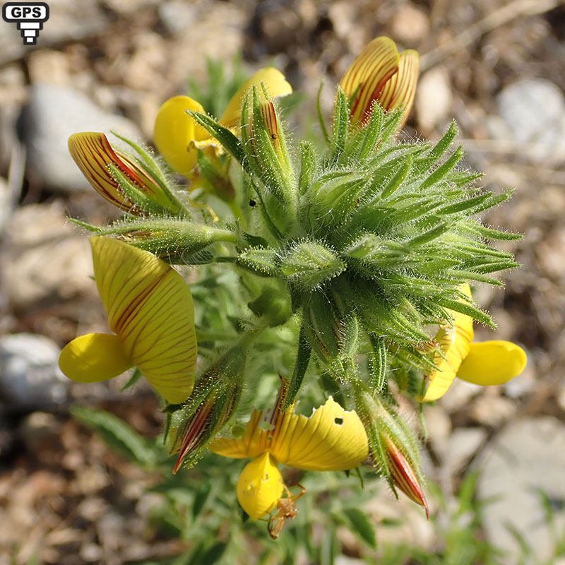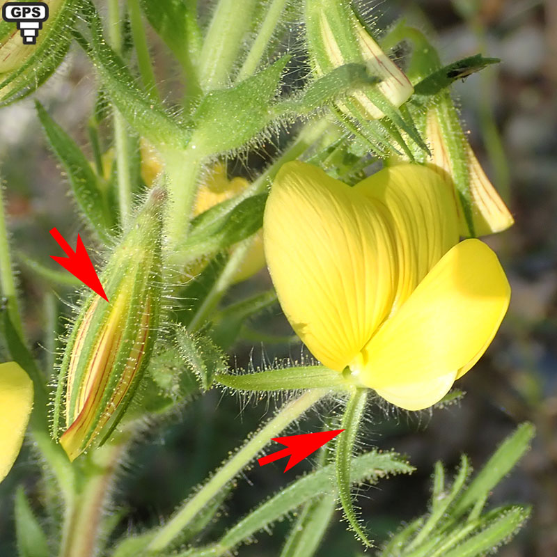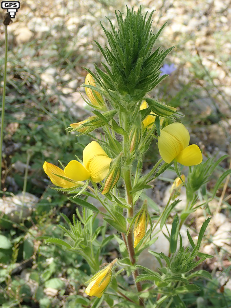 Cette bugrane, à port dressé, sous-ligneuse à la base et rameuse pousse dans les sous-bois rocailleux et les garrigues. Ses fleurs jaunes souvent striées de rouge sont grosses (pour une bugrane). L'ensemble de la plante est couverte de poils gluants glanduleux.