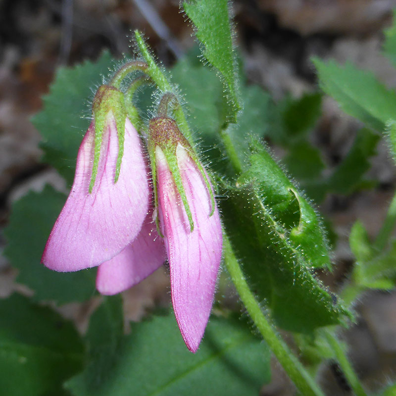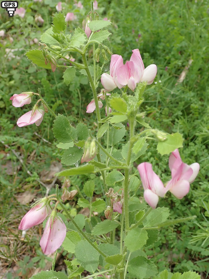 Cette bugrane est caractérisée par la rondeur des folioles de ses feuilles notamment la foliole terminale. Elle pousse dans les prairies rocailleuses, les bois clairs, les rochers ombragés,à la lisière des forêts, de préférence sur sols calcaires. Toute la plante est couverte de poils glanduleux abondants rendant la plante un peu collante. Les fleurs sont groupées par deux à trois, sur de petits rameaux axillaires sans feuilles. L'étendard est strié de rouge.