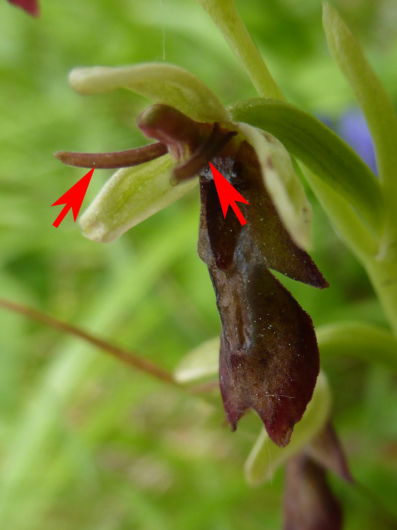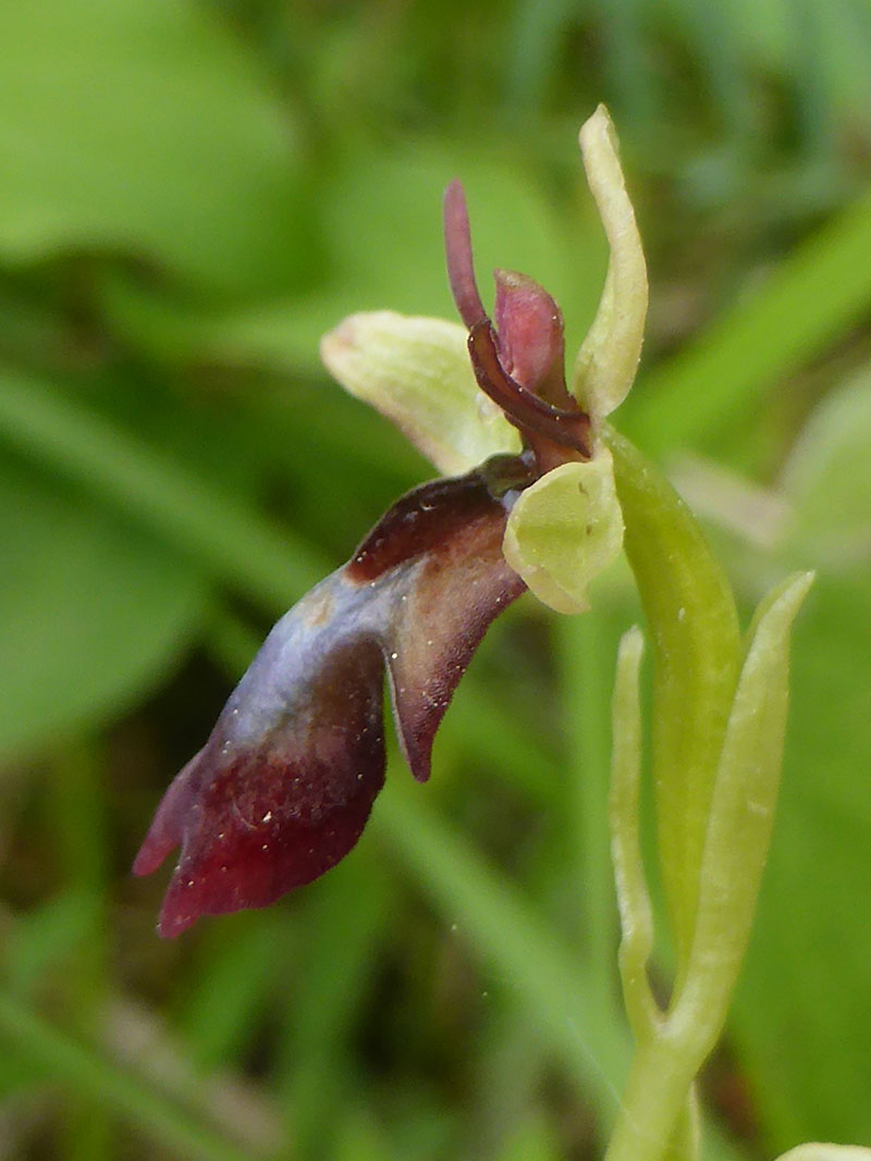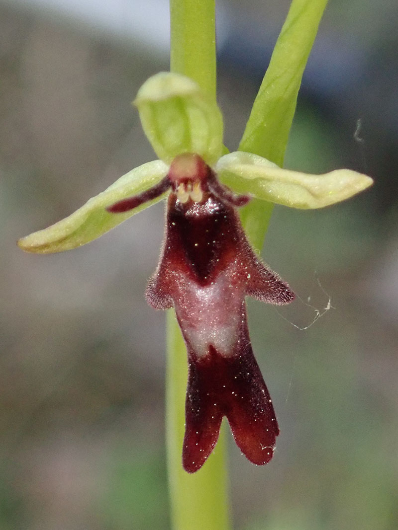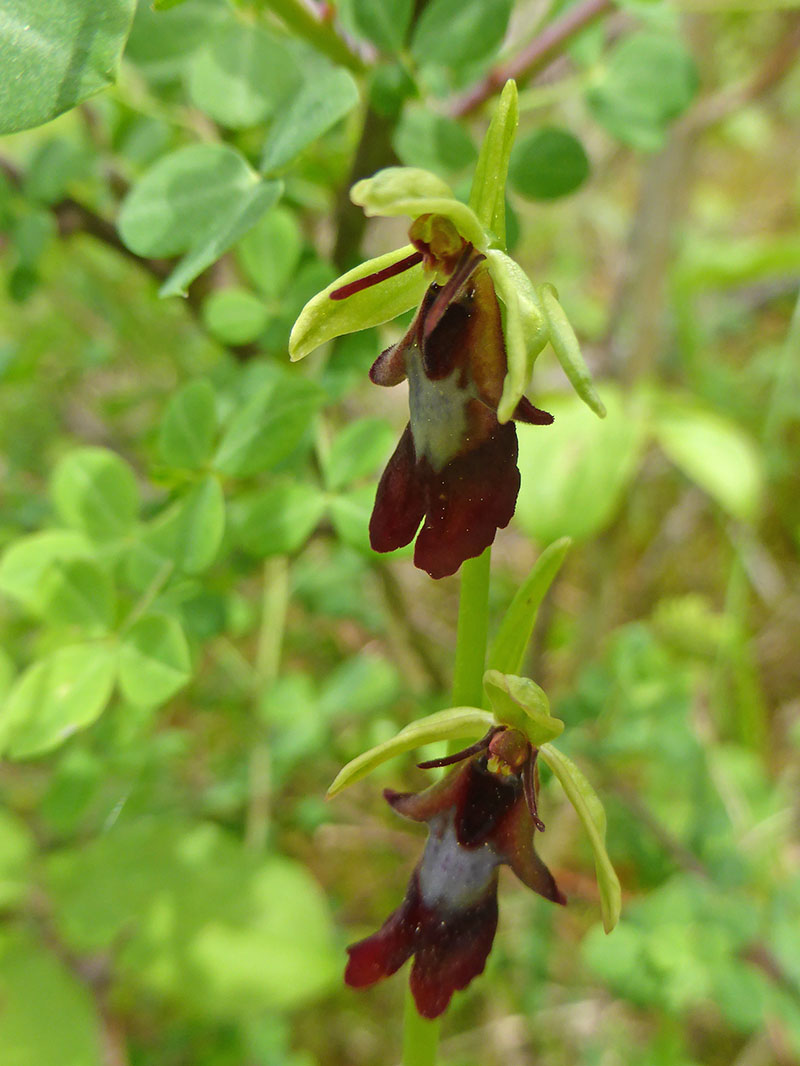L'ophrys mouche est une plante vivace que l'on rencontre dans les bois, les prés secs et sur les coteaux herbeux dans une grande partie de la flore. Les feuilles sont ovales très allongées, aiguës et dressées. Elle produit de 2 à 10 petites fleurs réunies en un épi lâche et pourvues de bractées linéaires. Chacune d'entres elles porte un labelle à trois lobes marron avec une macule blanc bleuâtre, les latéraux courts et triangulaires, le médian plus grand, allongé et lui-même partagé en 2 lobes. Les 2 pétales supérieurs ont la forme de lanières étroites brun-rougeâtre. C'est une espèce vivace, à tige grêle portant à la base deux tubercules arrondis.