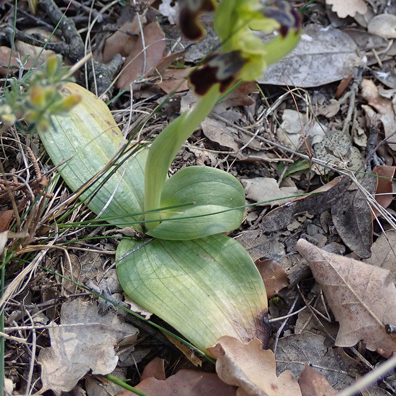 L'ophrys marbré est une plante vivace précoce qui pousse sur les pelouses sèches, au bord des chemins ou dans les forêts claires sur un sol basique (calcaire). Il ne pousse que dans une petite bande méditerranéenne et au Sud de la Corse (région de Bonifaccio). Il ne produit que 1 à 4 fleurs à périanthe jaune-vert. Le labelle est presque entier ou à lobes peu marqués avec une fine bordure d'au moins 3/10 de mm. Sa couleur de fond est hétérogène avec une macule occupant une grande surface d'aspect gris-bleuâtre. Le pétale supérieur est replié sur le gynostème, les pétales latéraux sont assez larges et lancéolés. Son bord inférieur est légèrement échancré.
