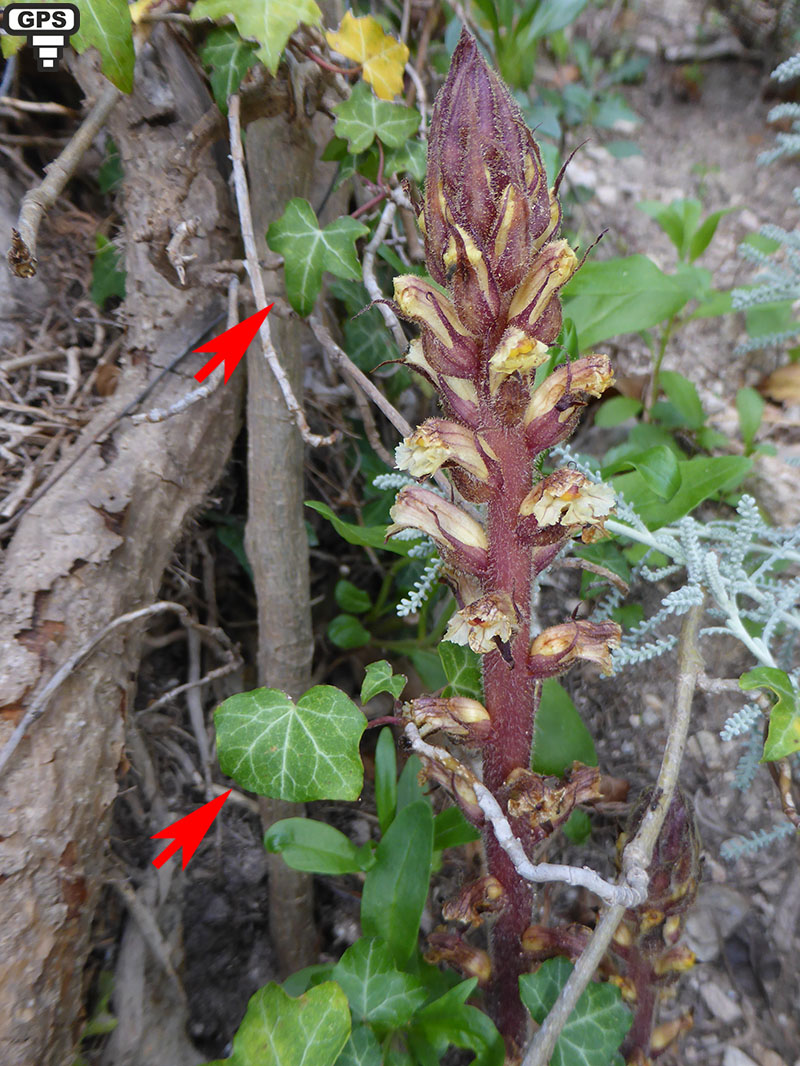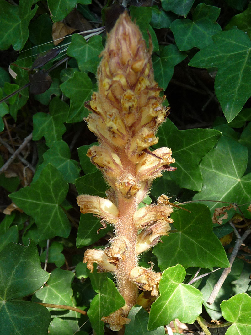 L'orobanche du lierre appartient au genre orobanche qui comprend de nombreuses espèces pas faciles à différencier les unes des autres, le meilleur moyen de les distinguer est de regarder la plante qu'elles parasitent, en l'occurence le lierre. L'orobanche présente une tige simple généralement rougeâtre portant des poils glanduleux. Les écailles garnissant celle-ci sont ovales-allongées, assez distantes les unes des autres sauf à la partie inférieure et mesurent de un à deux centimètres de longueur. Les fleurs sont groupées en épi devenant lâche et allongé au fur et à mesure de la croissance de la plante. Les calices, aussi longs que les tubes des corolles, sont séparés en deux parties réunies entre elles à la base et présentant chacune une seule nervure. La corolle des fleurs est glabre avec deux lèvres, la supérieure à deux lobes et l'inférieure à trois lobes bien marqués, celui du milieu plus long que les autres. Les étamines sont insérées à trois ou quatre millimètres de la base de la corolle ; le style est violacé avec un stigmate jaunâtre. L'espèce est presque toujours parasite du lierre (Hedera Hélix). Elle est présente dans de nombreuses régions de France mais dans des secteurs disséminés où elle peu être abondante.