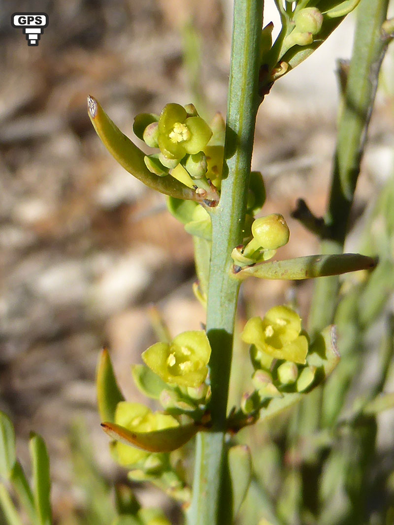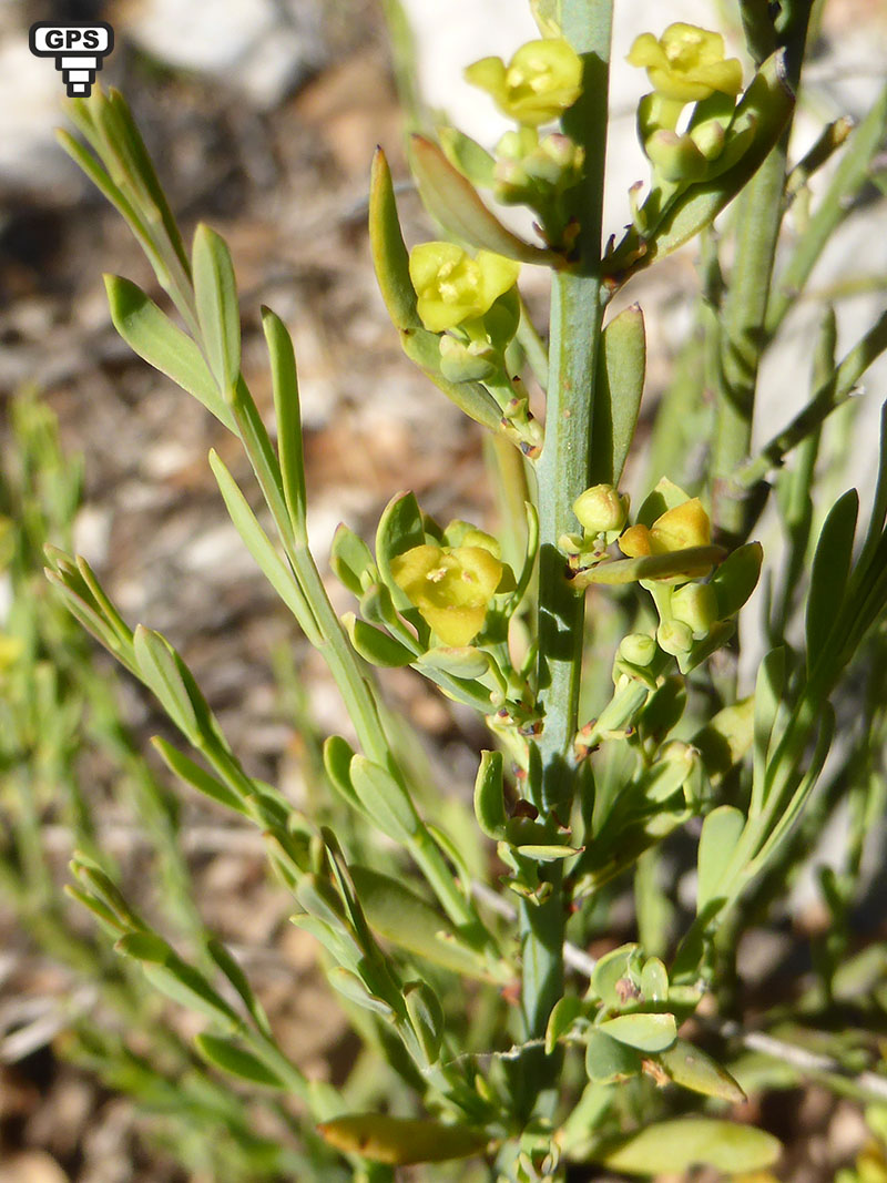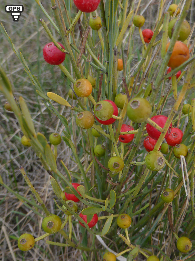 Sous-arbrisseau des régions méditerranéennes, l'osyris blanc est commun dans les lieux arides et les garrigues. Il porte mal son nom, car ses minuscules fleurs sont jaunes et, caractéristiques des santalacées, avec un périanthe à 3 lobes triangulaires. Les fleurs mâles sont groupées en petites grappes, les femelles sont solitaires au bout de rameaux feuillés. Les fruits sont des baies rouges entourées de petites feuilles allongées. Les fleurs de cette plante dioïque sont portées par des pieds différents. Les fruits rouges, à maturité, sont reliés à la tige par un pédoncule dressé.