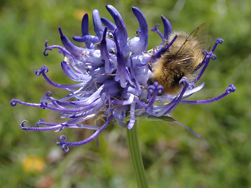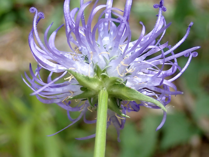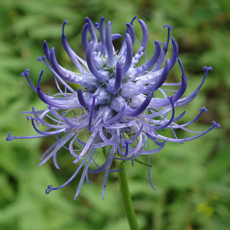 La raiponce orbiculaire est une plante vivace à tiges dressées qui croît dans les pelouses, sur les coteaux secs et les prairies montagneuses principalement dans tous les massifs montagneux métropolitain principalement calcaires. C'est une plante est rameuse qui émet plusieurs tiges fines peu feuillées. Elle est assez polymorphe et ses feuilles particulièrement peuvent avoir des aspects différents. Celles-ci sont généralement fermes, crénelées - dentées, allongées ou ovales-allongées ou parfois à limbe en forme de coeur renversé ; les inférieures sont pétiolées et les supérieures sont sessiles. Les fleurs sont réunies en capitules d'abord globuleux puis ovoïdes en fin de floraison. Les bractées de l'involucre sont ovales-lancéolées, plus longues ou plus courtes que les fleurs. Les calices ont des lobes ovales-lancéolés et ciliés. Comme pour toute les raiponces, la corolle des fleurs est divisée en 5 pétales très étroits, d'abord soudés entre eux et formant un tube. Ils se séparent en s'étalant en étoile pendant la floraison. Le style se termine par 3 stigmates enroulés. Elle se perpétue et se multiplie par des divisions de la tige souterraine.