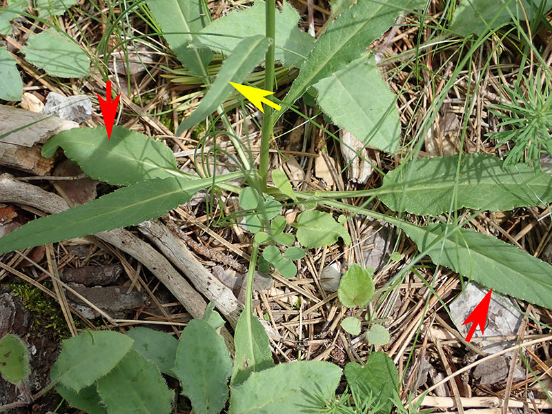Feuilles de la base pétiolées (flèches rouges), celles de la tige sessiles (flèche jaune)