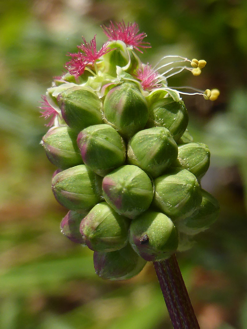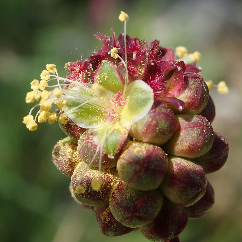 La pimprenelle est une plante vivace assez commune au printemps dans les prés humides ou les pelouses sèches, les bois, les endroits incultes, au bord des fossés. La tige est anguleuse le plus souvent dressée, plus rarement couchée. Les feuilles inférieures ont 9 à 25 folioles au contour de forme ovale et bordées de crénelures tout autour. A mesure qu’elles s’élèvent sur la tige, les feuilles ont des folioles moins nombreuses et plus allongées, devenant aiguës et profondément dentées en scie. Les folioles sont portées sur de petits pétioles secondaires. Elle produit des fleurs dépourvues de pétales, avec uniquement un calice à sépales ovales, de couleur verte mêlée de pourpre et à bord blanc. Elles sont disposées en épis ovoïdes comportant à la fois des fleurs mâles, des fleurs femelles et des fleurs hermaphrodites. Les fleurs femelles ont un stigmate en pinceau rouge disposées en haut de l'inflorescence, les fleurs mâles ont de nombreuses étamines à anthères jaunes et placées plus bas. Elle se perpétue par des bourgeons nés sur la tige souterraine.La pimprenelle est utilisée en usage interne, notamment pour ses propriétés astringentes, anti-diarrhéiques, diurétiques, digestives et toniques, ainsi qu'en usage externe, pour ses propriétés astringentes, cicatrisantes et hémostatiques.
