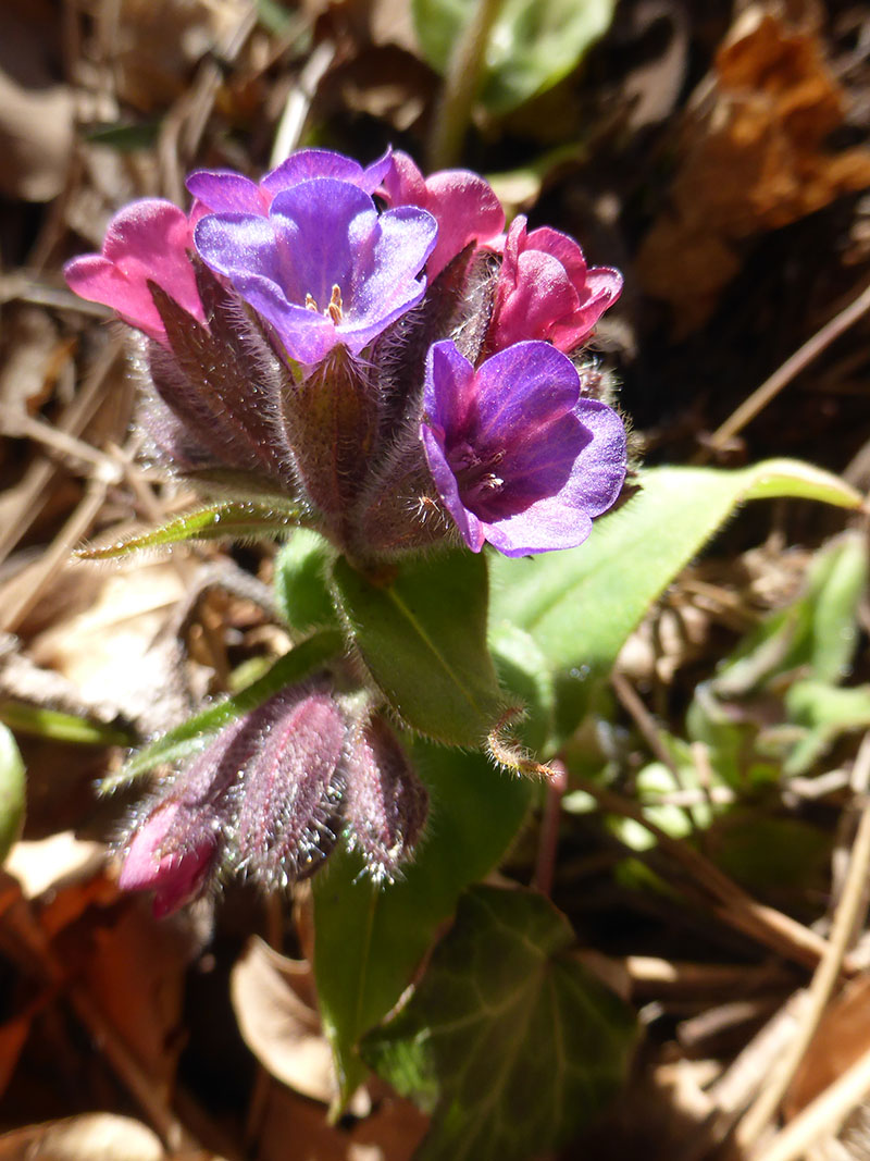 La pulmonaire saupoudrée a des feuilles très larges et marquées de grosses taches blanches même en début de floraison. C'est une espèce plutôt montagnarde.