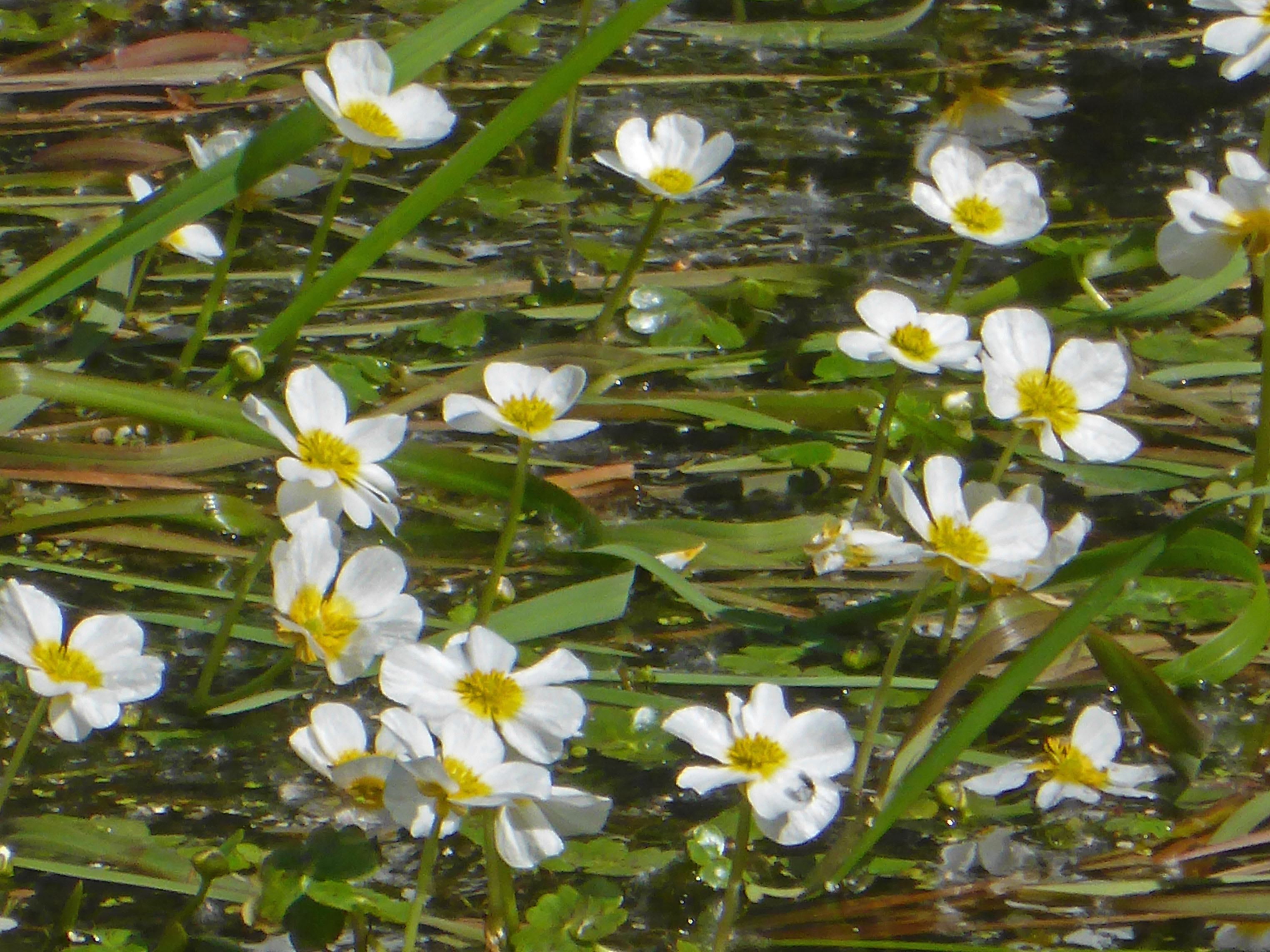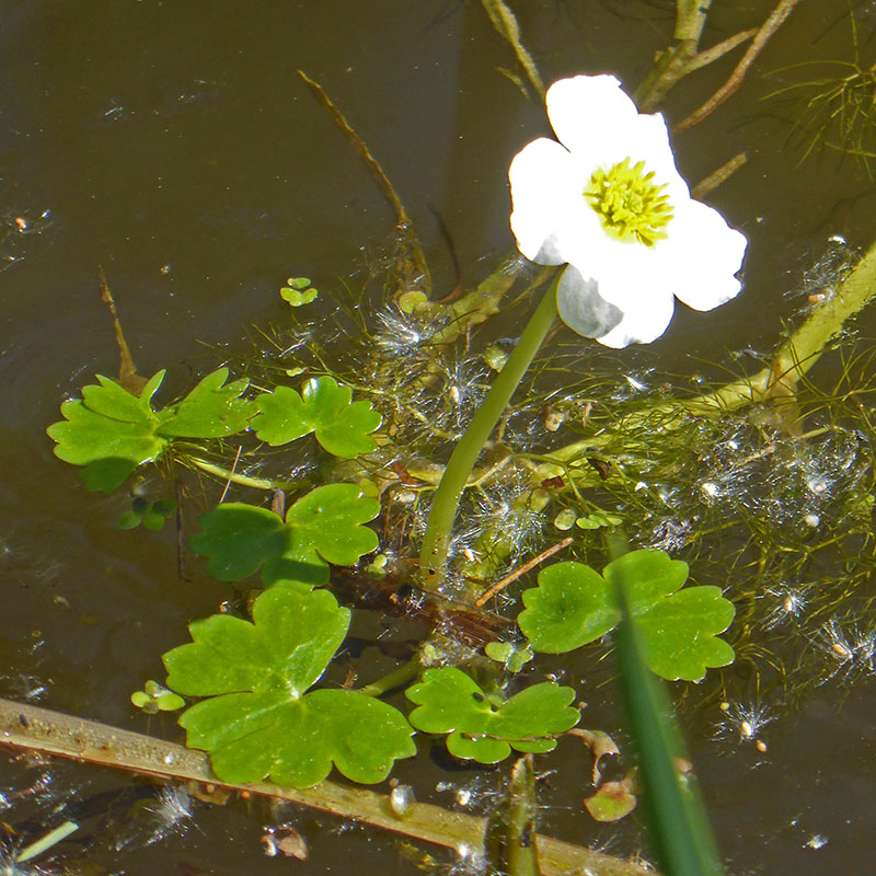 La renoncule aquatique est une plante vivace des eaux stagnantes peu profondes, qui croît parfois également dans la vase humide : on la trouve notamment dans les mares et les étangs. Les feuilles sont de formes très diverses, mais il y en a toujours un plus ou moins grand nombre qui sont divisées en fines lanières. Les flottantes sont élargies en rein avec de 3 à 5 lobes plus ou moins profonds. Les tiges ont de 10 cm à 5 m de longueur et portent çà et là des racines adventives qui sont insérées vers la base feuilles. La corolle est formée de 5 pétales, son centre est jaune, elle dépasse de quelques centimètre la surface de l'eau.