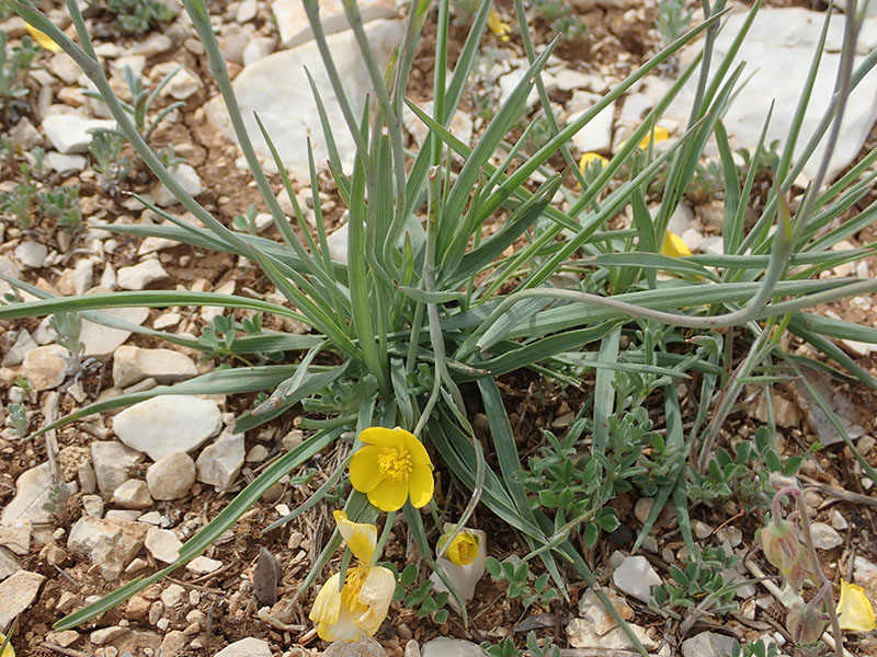 La renoncule à feuilles de graminée est une plante vivace qui croît sur les terrains secs, herbeux et rocailleux des montagnes où elle ne dépasse pas l'étage montagnard ou dans les bois en plaine. Elle se reconnaît à ses nombreuses feuilles très étroites, glauques, presque toutes à la base de la plante, et dont la touffe surmonte les débris des feuilles détruites à la fin de la saison précédente. Elles sont linéaires - lancéolées avec des nervures longitudinales parallèles. Sa tige est peu ou non ramifiée, elle est coiffée par deux ou trois fleurs jaunes d'environ 2 cm de diamètre dont les sépales sont souvent lavés de rouge et toujours dépourvus de poils. Le fruit est formé de carpelles qui ont des nervures saillantes disposées en réseau irrégulier et surmontés chacun d'un style persistant extrêmement court. La tige souterraine est courte.