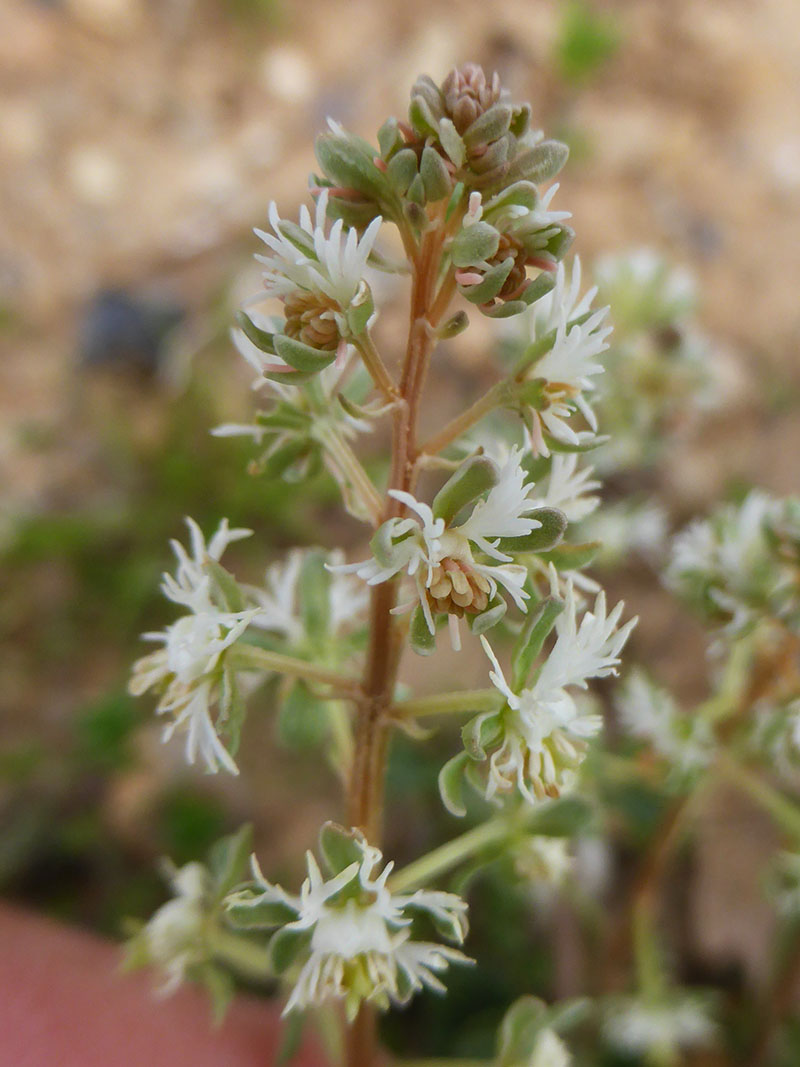 Le réséda raiponce produit des grappes de minuscules fleurs blanchâtres allongées et lâches. Ses fleurs ont des pétales divisés, très étroits et blancs. Les anthères des 16 à 20 étamines sont beiges et d’une taille disproportionnée par rapport aux pétales. Ce réséda se rencontre dans les garrigues, les pelouses sèches, les vergers et les jardins des départements méditerranéens.