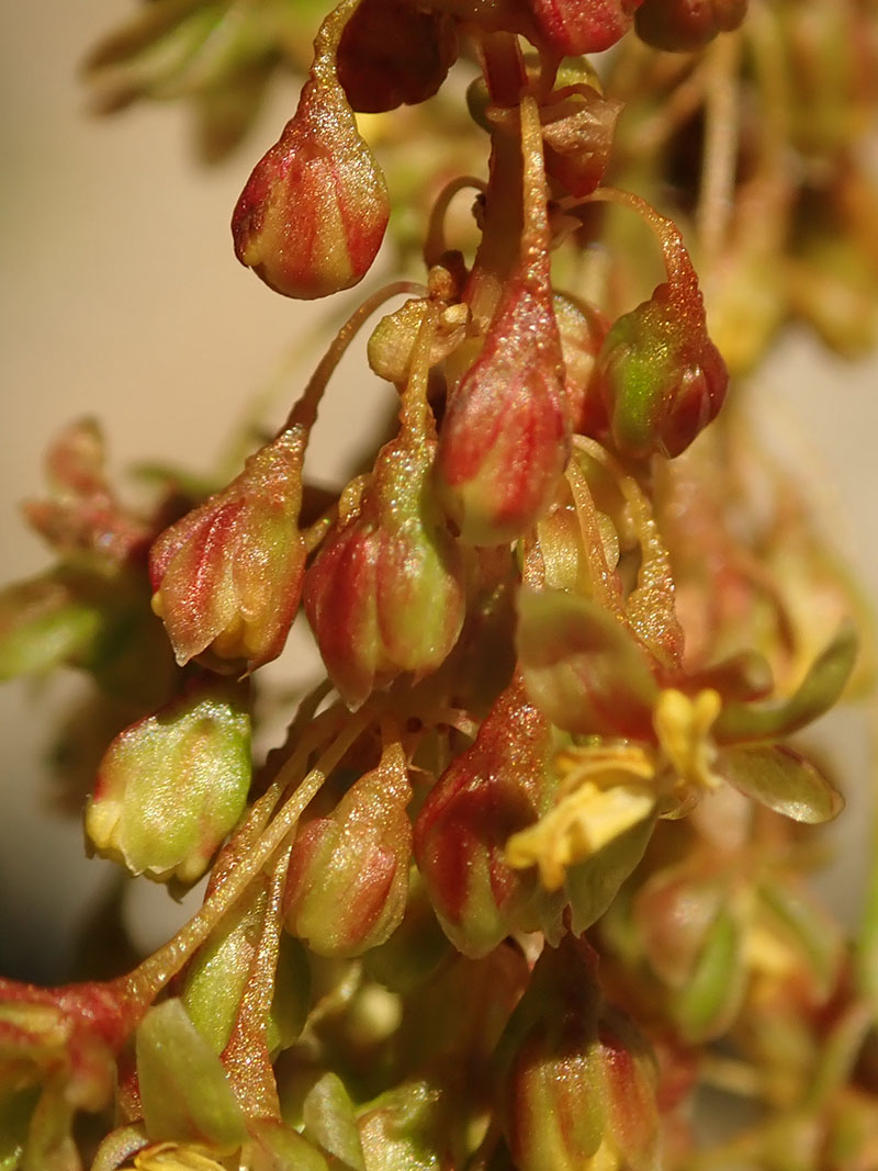 Fruits akènes envelopés dans des valves fructifères ovales en coeur