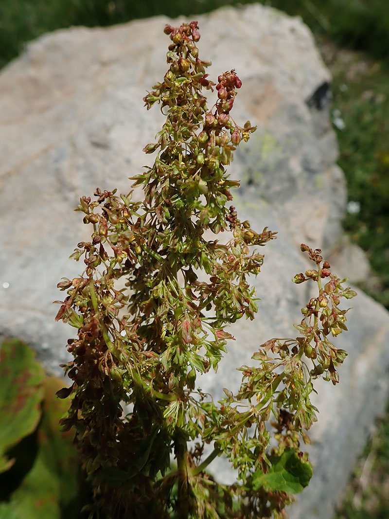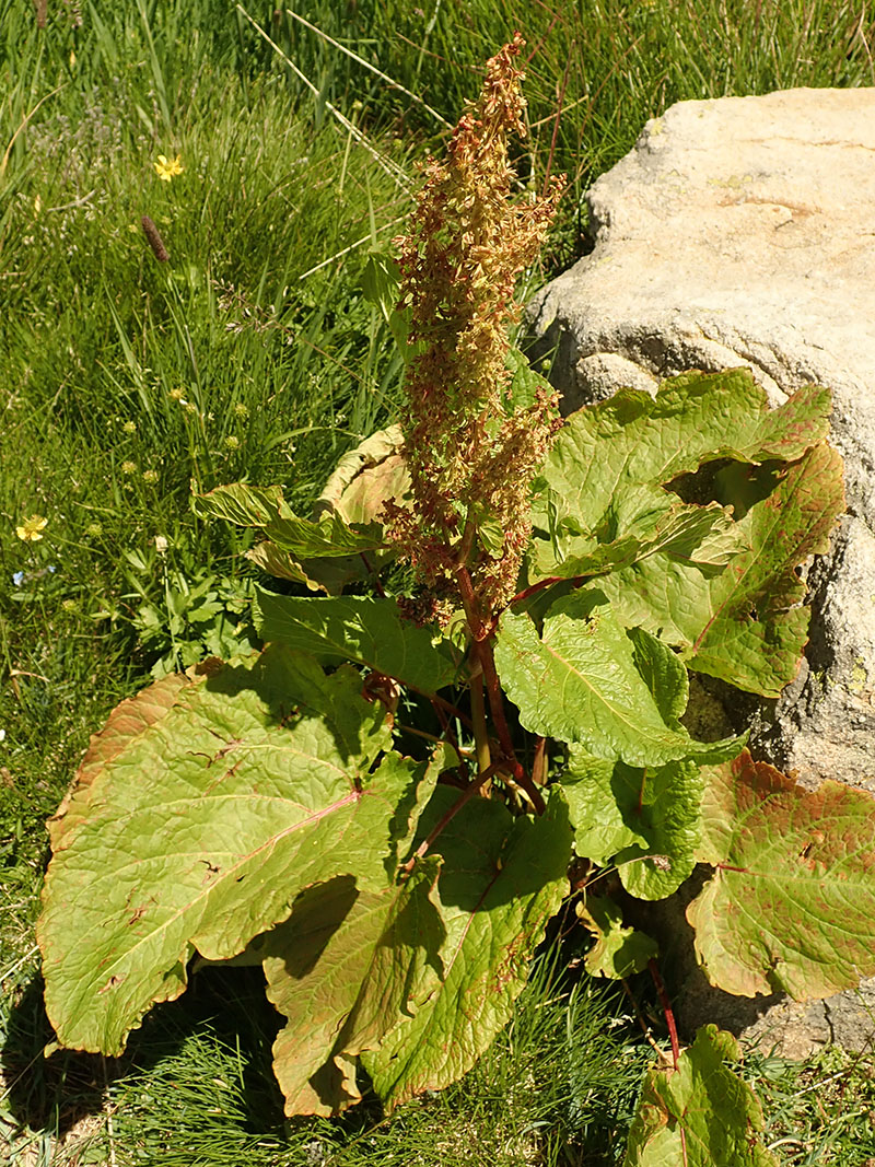 L'oseille des Alpes est une plante vivace orophyte commune près de reposoirs à bétail où elle forme de grands massifs. La tige estdressée, épaisse, sillonnée dans sa longueur. Les feuilles sont grandes, de consistance molle, à limbe en forme de coeur renversé, à nervures en réseau, ondulé ou un peu dentelé sur les bords, les moyennes et les inférieures obtuses au sommet, les supérieures aiguës. Le pétiole, très allongé (sauf dans les feuilles florales) est en gouttière sur sa partie supérieure. Les inflorescences verdâtres ou rougeâtres sont composées de minuscules fleurs pendantes. Elles sont dressées et denses. La plante se perpétue et se multiplie par des bourgeons nés sur la tige souterraine.Les jeunes feuilles se mangent en salade ou comme les épinards. Les pétioles pelés et mangés crus ou cuits comme la rhubarbe de consomment en tartes et compotes. Il était traditionnel dans les Alpes suisses de le mettre à lacto-fermenter, les vachers y préparant une sorte de choucroute. Ses grandes feuilles acides servaient à envelopper les produits descendus de la montagne (beurre des burronniers, parfois truites, etc.), assurant ainsi leur conservation. En Roumanie, elles servent à faire de la soupe. La racine a des propriétés médicinales : riche en composés anthracéniques, elle est laxative et dépuratif. (Wikipedia)