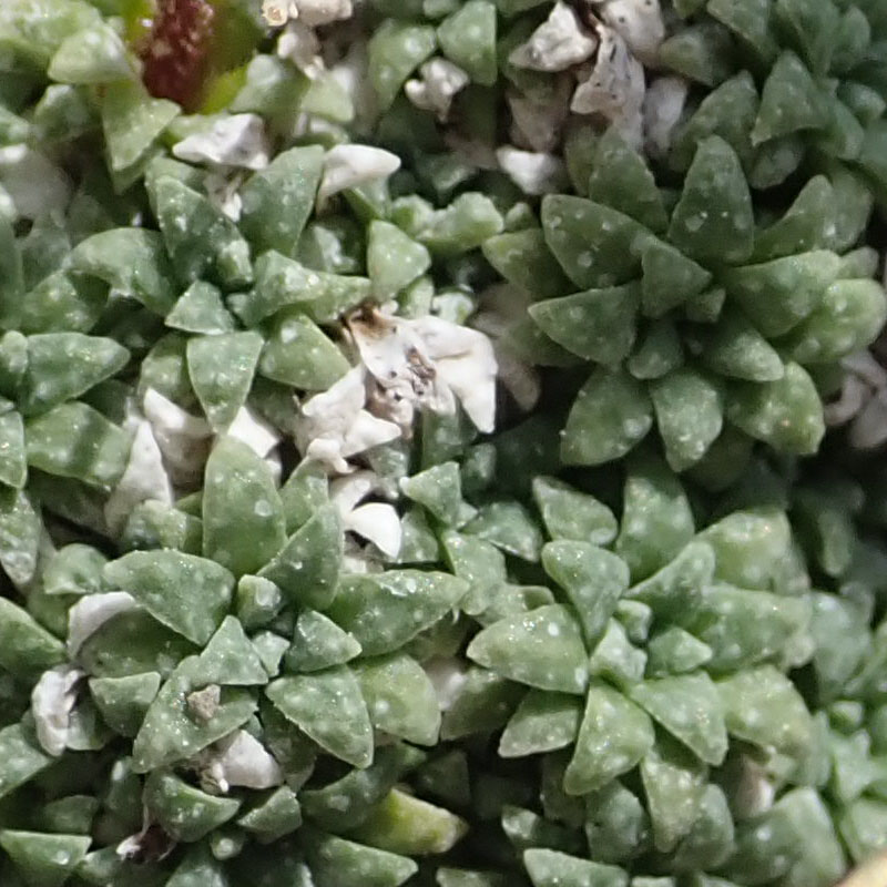 Feuilles en rosette, étroitement imbriquées, glauque, arquées en dehors, carénées - triquètres, entières, marquées de 5 à 7 taches blanches