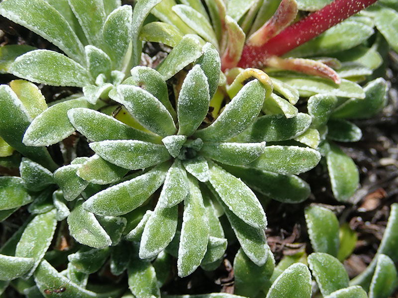 Feuilles en rosette à la base linéaires lancéolées, avec le limbe marqué de crénelures blanches sur les bords