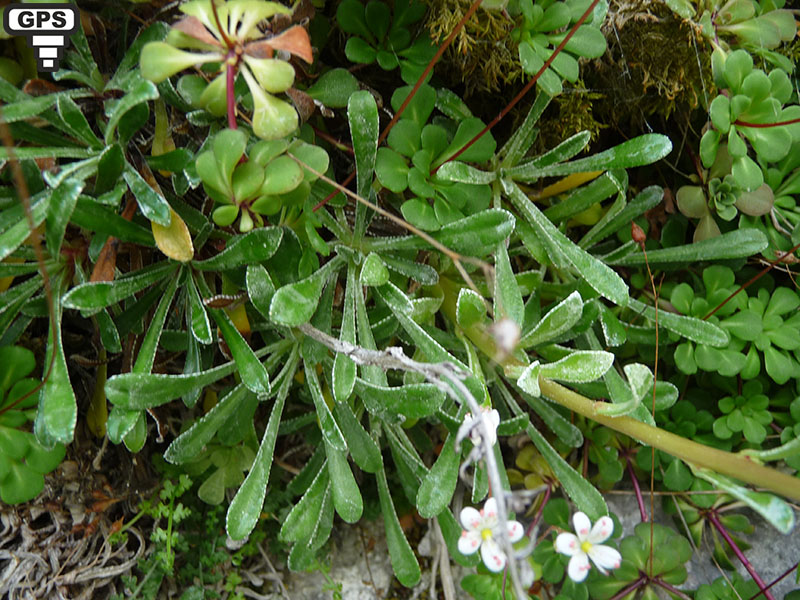 La saxifrage à feuilles en languette aime les endoits humides : faille de rocher près d'une source par exemple. Ses feuilles ont les bord recouverts de crénelures blanches irrégulières qui seraient dues à des dépôts de calcaire (c'est une plante qui vit exclusivement dans les rochers calcaires). Ses fleurs blanches ont des pétales parfois marqués de petites taches rougeâtres plutôt vers la base. Les pédoncules et les tiges sont glabres ou presque. Elle est cantonnée au montagnes du Sud-Est de la France. On la distingue de la saxifrage paniculée par les points rouges sur les pétales, la présence d'un liseré blanc sur le bord des feuilles et l'abondance des fleurs.