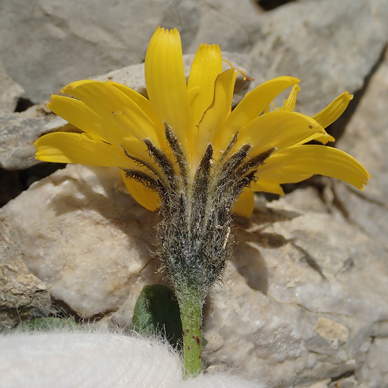 Le liondent des montagnes vit dans les éboulis calcaires de l'étage alpin. Cette une petite plante dont la fleur ne dépasse guère des caillous qui l'entourent. Ses capitules jaunes sont composés de fleurons tous ligulés, son involucre à folioles lancéolées est recouvert de poils noirs étalés.