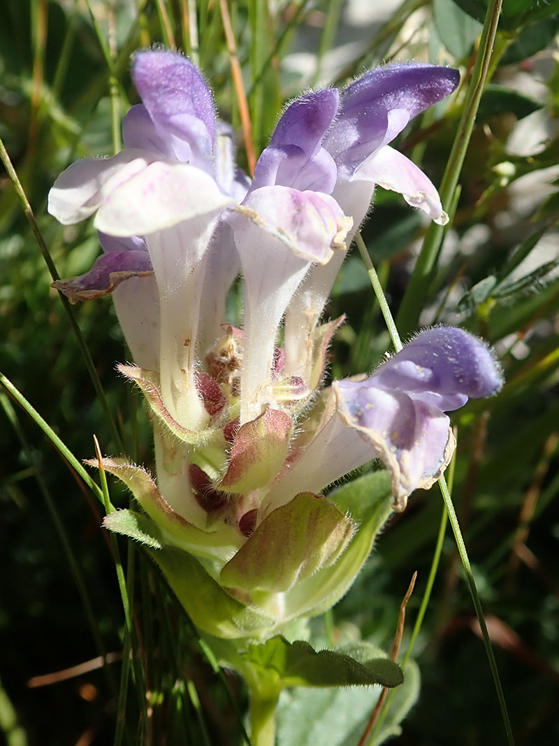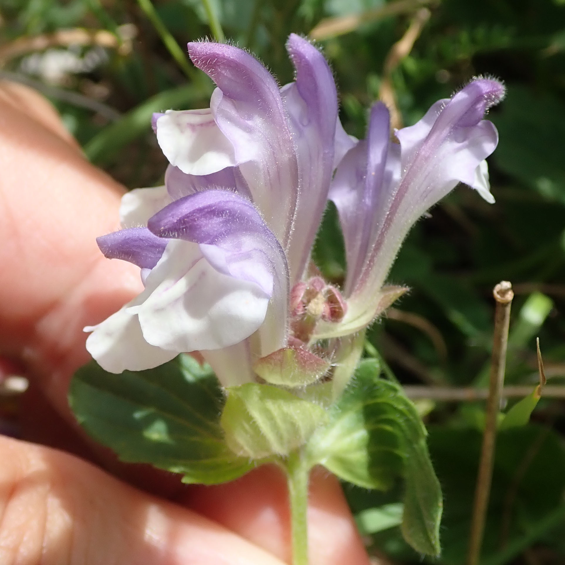 La scutellaire des Alpes est une plante vivace poussant dans les rochers et les endroits rocailleux des hautes montagnes calcaires, Alpes, Pyrénées mais aussi en Bourgogne. Elle présente de nombreuses tiges dressées ou redressées de 10 à 15 cm de hauteur. Les feuilles vert foncé sont toutes pétiolées, plus ou moins poilues, à limbe ovale, obtus au sommet, largement crénelé ou denté sur les bords. L'inflorescence est un glomérule de fleurs séparées par de petites bractées pâles souvent teintées de rouge et beaucoup plus courtes que les fleurs. Le calice est velu- glanduleux, à peu près de la même longueur que le pédoncule qui le porte. La corolle pubescente et très saillante, présente un tube recourbé qui s'élargit sur le haut avec la lèvre inférieure blanche et retombante, et la lèvre supérieure bleu-violacé et dressée. Les tiges florifères portent souvent des racines adventives dans leur partie couchée. La tige souterraine est épaisse, ligneuse, dure, et produit de nombreux bourgeons.