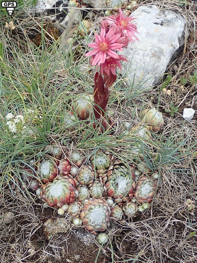 La joubarbe à toile d'araignée se rencontre entre les rochers des moyennes et hautes montagnes, c'est une plante succulente. Ses fleurs rose vif sont petites (20 mm de diamètre maximum) et disposées en corymbe. Les pétales étalés, ovales - lancéolés, aigus, glabres, ciliés au sommet, sont une à deux fois plus longs que le calice. On la reconnait facilement aux fils blancs ressemblant à une toile d'araignée recouvrant les feuilles ; celle-ci forment de petites rosettes de diamètre de 1 à 3 cm de diamètre.