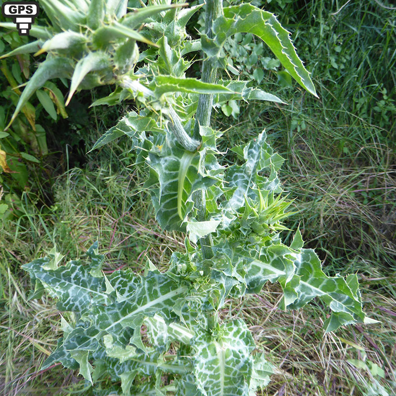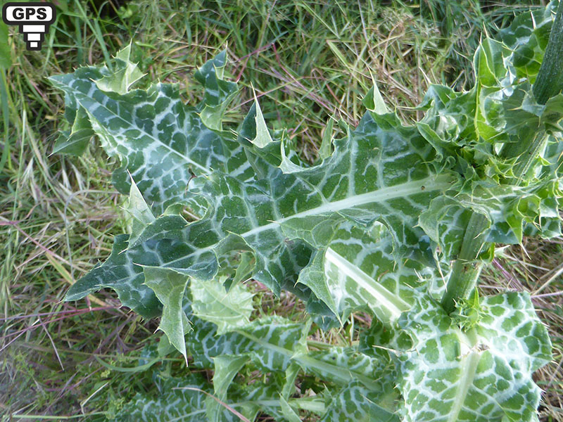Feuilles marbrées de blanc sur le recto, celle de la base sont pétiolées et forment une rosette, les caulinaires sont sessiles. Toutes sont pennatifides avec des lobes bordés d'épines.