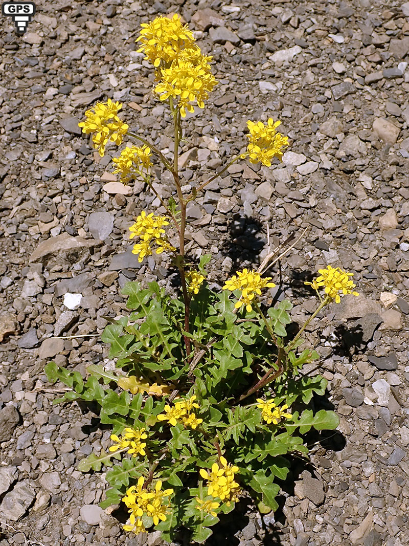 Cette plante bisannuelle ou pérennante à racine principale allongée est strictement orophyte, on ne la trouve que dans les montagnes (principalement Pyrénées et Alpes) milieu calcaire ; elle aime les rochers et les lieux pierreux où elle donne de nombreuses grappes denses de petites fleurs jaunes. Les fleurs ont des sépales qui sont égaux aux pédoncules ou un peu plus courts. Les fruits sont dressés, bosselés, et courbés vers la tige. Les feuilles sont profondément divisées, à lobes perpendiculaires à la nervure principale de la feuille. Le port de la plante assez caractéristique, et son caractère orophyte permet de l'identfifier assez facilement.