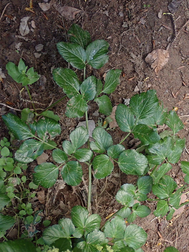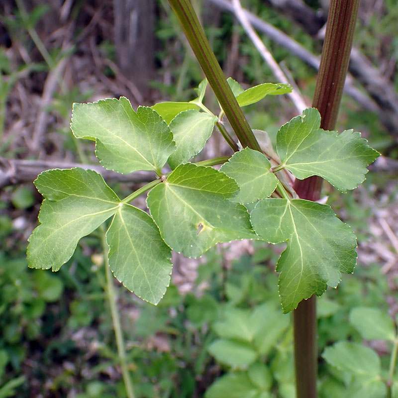 Feuilles trois fois ternatiséquées, à segments larges, ovales, crénelés ou dentés, les supérieures ternées, sessiles