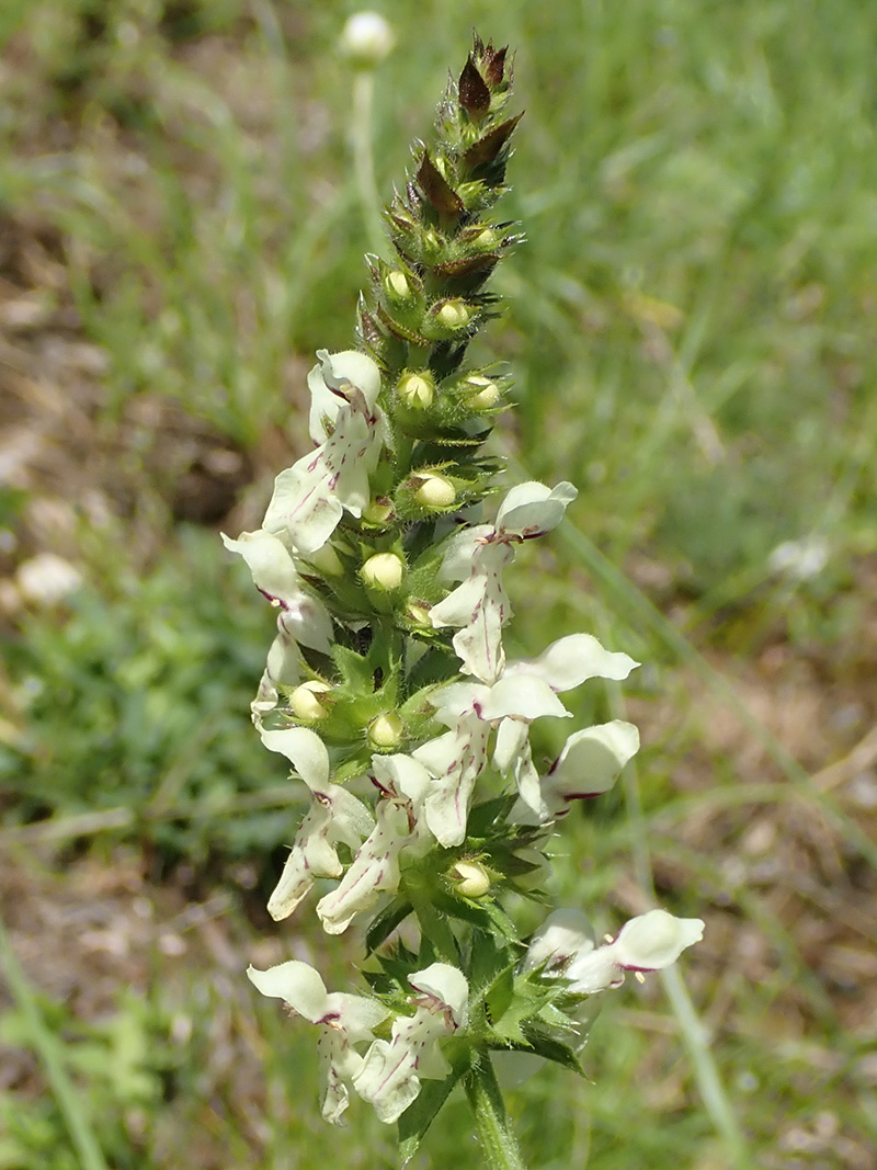 L'épiaire droite est une plante vivace répandue dans presque toutes les régions de France, elle est commune sur les coteaux et les endroits arides ou rocailleux. Elle produit des glomérules spiciformes de fleurs blanc jaunâtre maculées de brun pourpre sur la lèvre inférieure. Les corolles sont très peu larges et très allongées avec une lèvre supérieure entière et une lèvre inférieure échancrée. Le calice est couvert de poils étalés, ses sépales en forme de triangle sont dressées- étalées et ils sont terminées par une petite épine. Les feuilles qui accompagnent les fleurs sont également terminées par une épine. C'est une plante vivace, à tige souterraine presque ligneuse, à nombreuses tiges florifères dressées ou redressées qui se perpétue ou se multiplie par les divisions de la tige souterraine.
