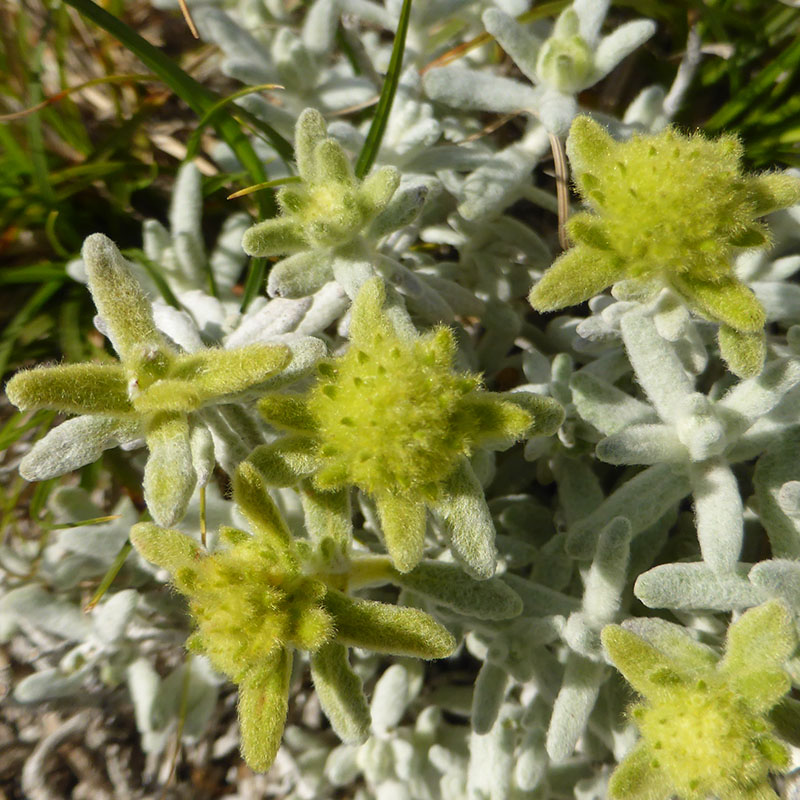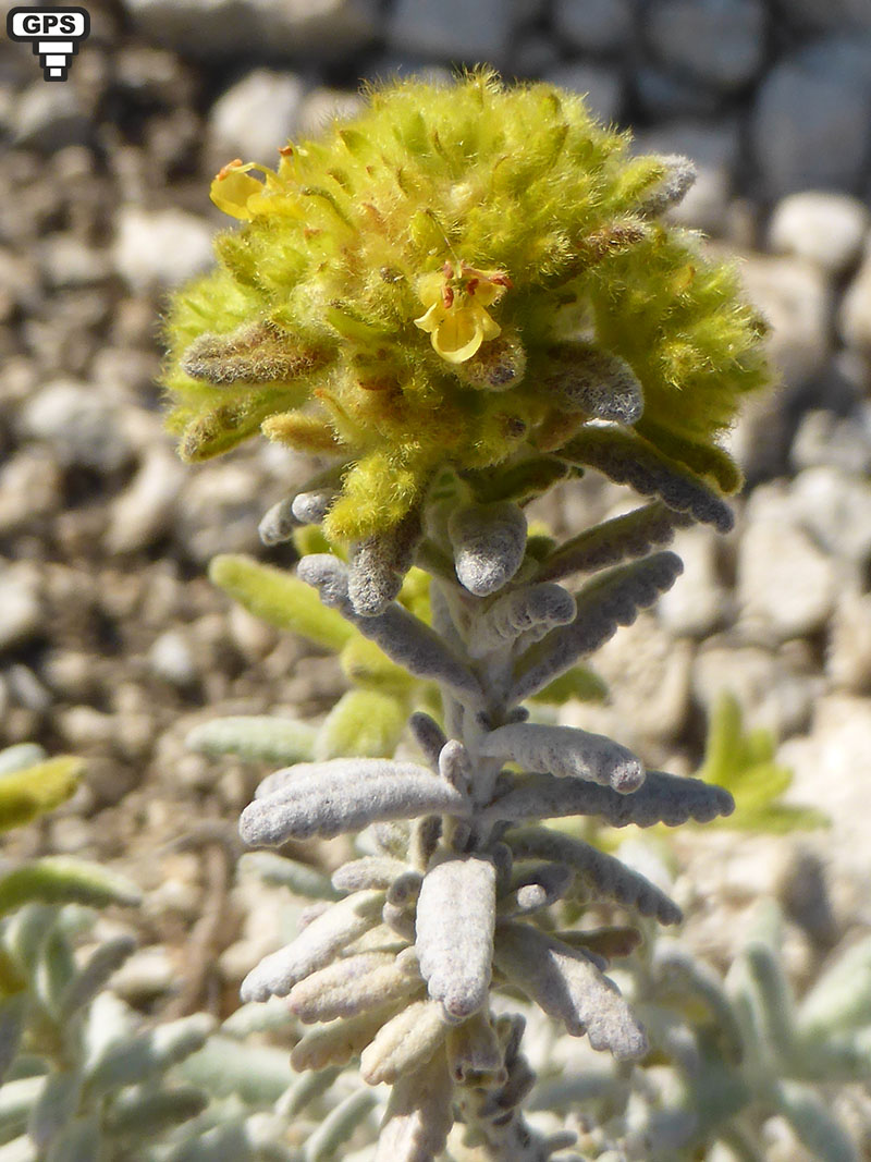 La germandrée dorée est une plante vivace poussant entre les rochers calcaires dans les lieux secs et pierreux. La plante entière est d'apect cotonneux. Ses tiges sont ligneuses à la base et ont perdu leurs feuilles les plus basses quand la plante fleurit. Les rameaux sont velus-cotonneux, d'une odeur forte et agréable. Les feuilles sont blanches-cotonneuses sur les deux faces, les supérieures souvent jaune doré, sessiles, ovales ou linéaires, obtuses, crénelées dans leur partie supérieure, avec les bords souvent enroulées. L'inflorescence est jaune doré, avec des fleurs très petites groupées en tête globuleuse au bout d'une tige qui s'élève au fur et à mesure de la floraison. Le calice, à dents inégales, est couvert de longs poils étalés jaunes. La corolle est également jaune doré et présente un lobe inférieur plus grand que les autres, de contour arrondi, les lobes supérieurs sont obtus et velus sur l'extérieur. Les quatre parties du fruit mûr sont brunes et ornées d'un réseau à leur surface.