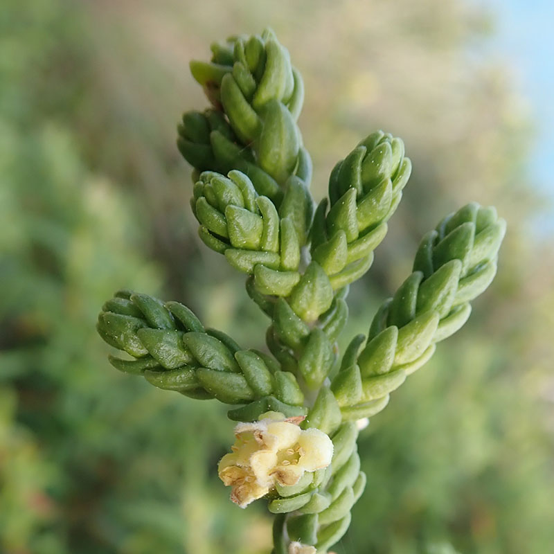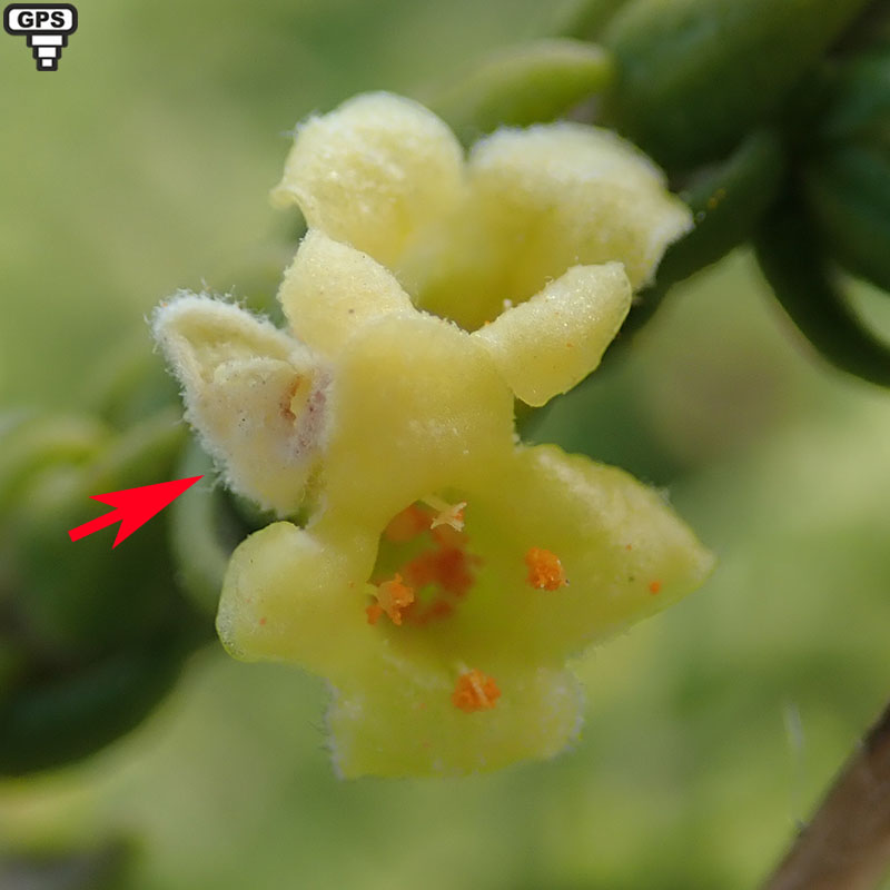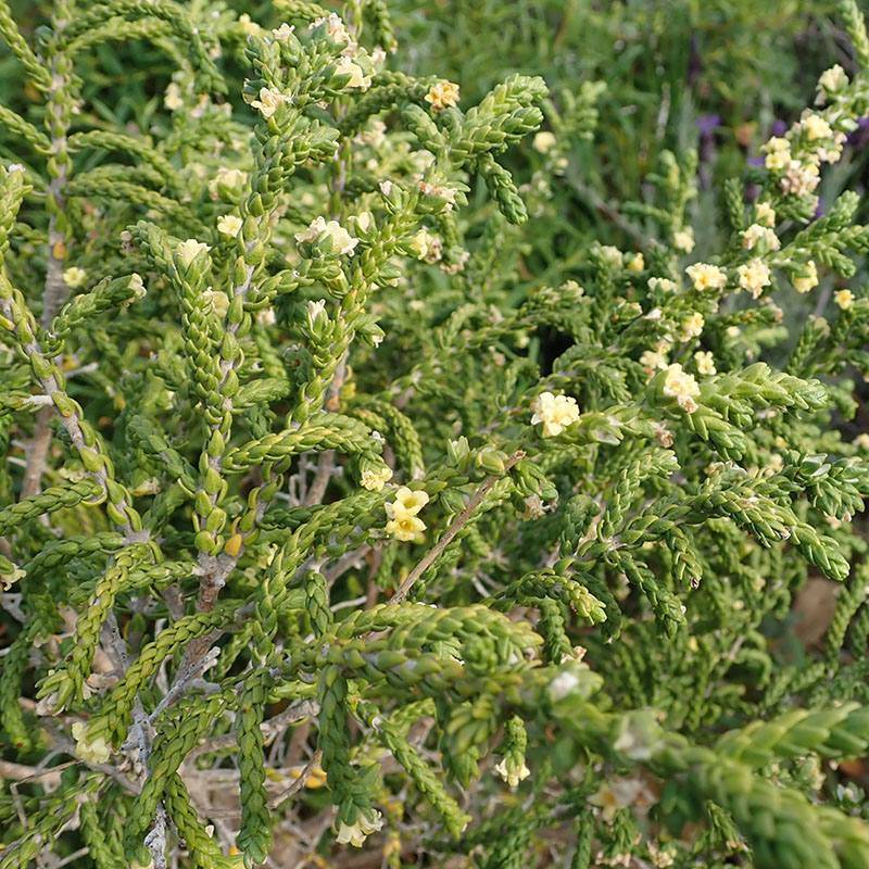 On trouve la passerine hérissée sur les sables et les rocailles du littoral de la Méditerranée. Elle est souvent accompagnée de la Barbe-de-Jupiter (Anthyllis barba-jovis). C'est un petit arbrisseau à tiges dressées, très rameuses, à rameaux étalés et plus ou moins retombants, cotonneux lorsqu’ils sont jeunes et dont les petites feuilles imbriquées recouvrent l'intégralité de la partie supérieure des rameaux. Elles sont épaisses, obtuses, glabres et brillantes sur le desssus. Les fleurs, sans bractées ni pédoncule, sont disposées par 2 à 5 au sommet des rameaux et à l'extrémité de courtes ramifications latérales. Le calice est entièrement cotonneux à l'extérieur, jaunâtre, sans poils à l'intérieur. Le fruit ovoïde, est d'abord enveloppé par le calice, puis nu, celui-ci n'étant pas persistant.La plante contient des diterpènes très toxiques. Un simple contact avec la peau ou les muqueuses peut provoquer une réaction inflammatoire intense.(Wikipedia)