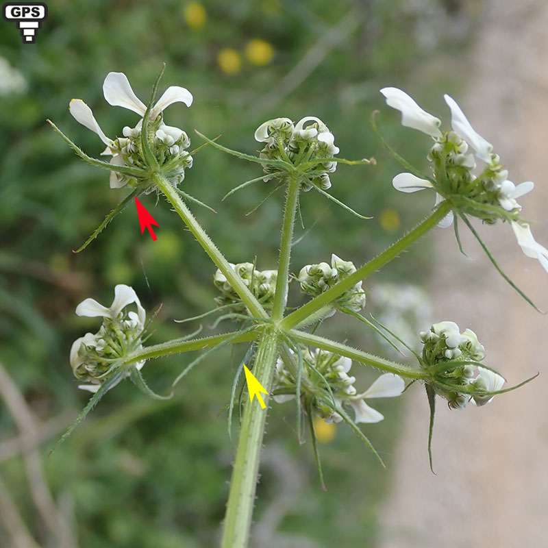 Bractées de l'involucelle (flèche rouge) et de l'involucre (flèche jaune) à cinq bractées et presque identiques